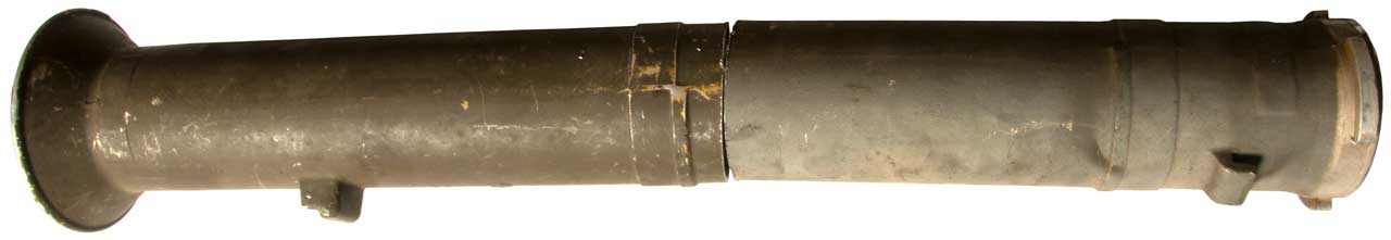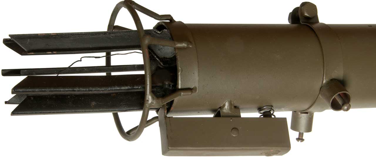 [pg 132] "The launcher length of barrer, fourteen inches, evolved as the length to make it unlikely that the gunner would accidentally get his fingers in front of the muzzle on firing. The barrel length required for interior ballistics was only a few inches, as the pressure dropped quite rapidly. Peak pressure on the low side is only three thousand pounds per square inch, compared to thirty thousand pounds per square inch in the high pressure chamber."