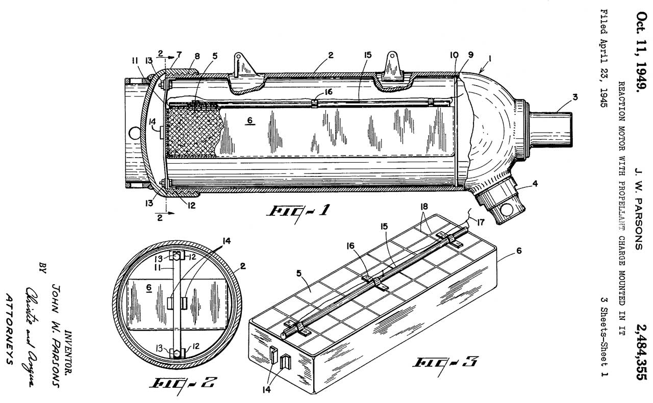 2469350 Rocket device, Charles C Lauritsen, Navy, app: 1943-04-02, W.W.II, Pub: 1949-05-10, - Electrical ignition by means of can shaped tail fin.