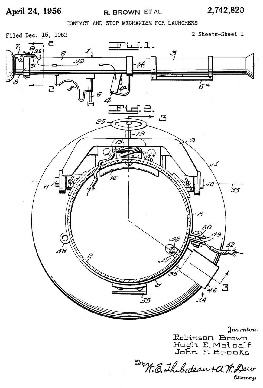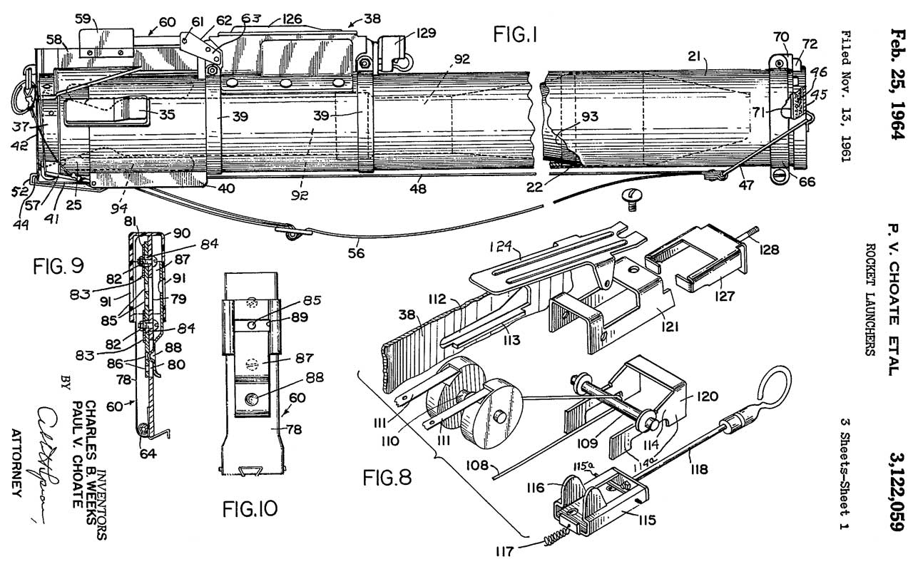 2751818 Latch mechanism for a rocket launcher, Mitchell E Bonnett, 1956-06-26, - Application might be 3.5" Bazooka.