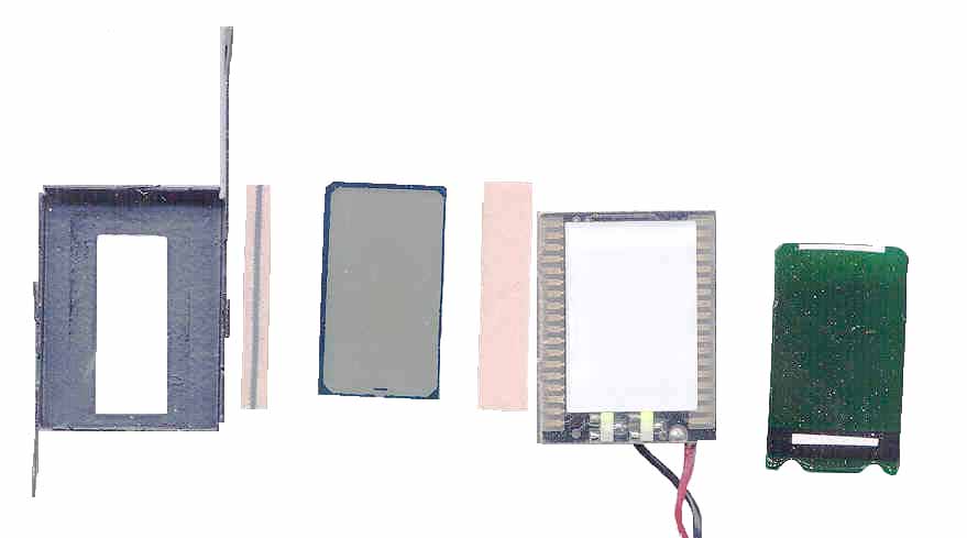 It has a very dark green filter between the 2 green LED back lights and the LCD. That's why the LCD on late model PRC-126 radios is very dim. By moving the Dark Green filter from the front to behind the LCD both daylight and NVG viewing are possible. You can see the two green LEDs are turned on. Left to right: metal housing, LCD contact strip showing the black conductive "fingers" in the center of the sandwich, the LCD, the other contact strip on it's side, the driver PCB with the back light in the center (the white square) and the two LCDs at the bottom, on the left and right side there are many contacts to drive the LCD, the very dense green filter with a strip of black tape (on thebottom end on the side opposite to the white stripe) that covers the LEDs.If you know who made these or any thing about them let me know.