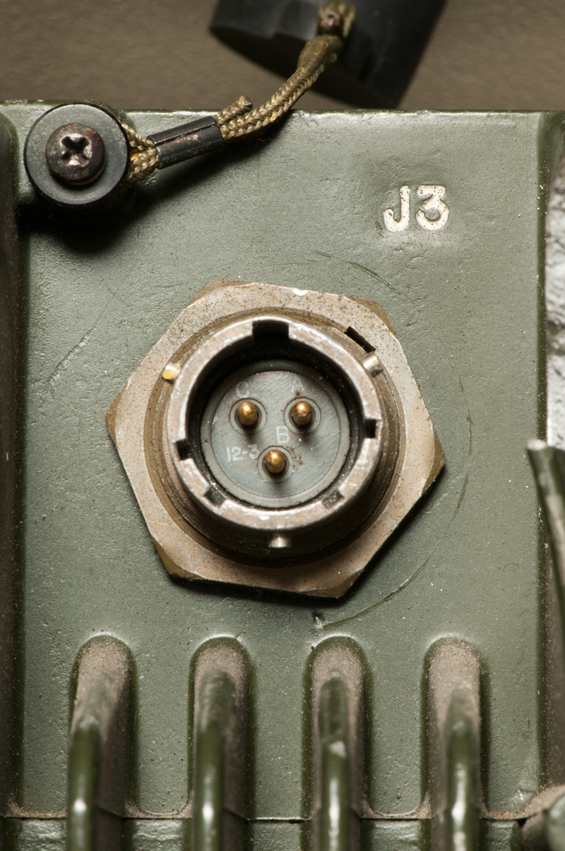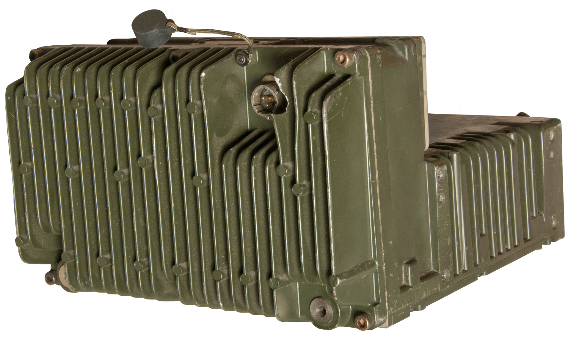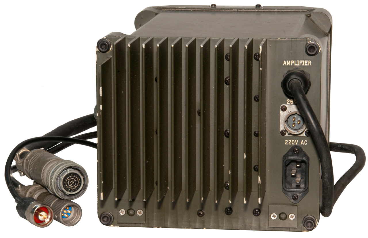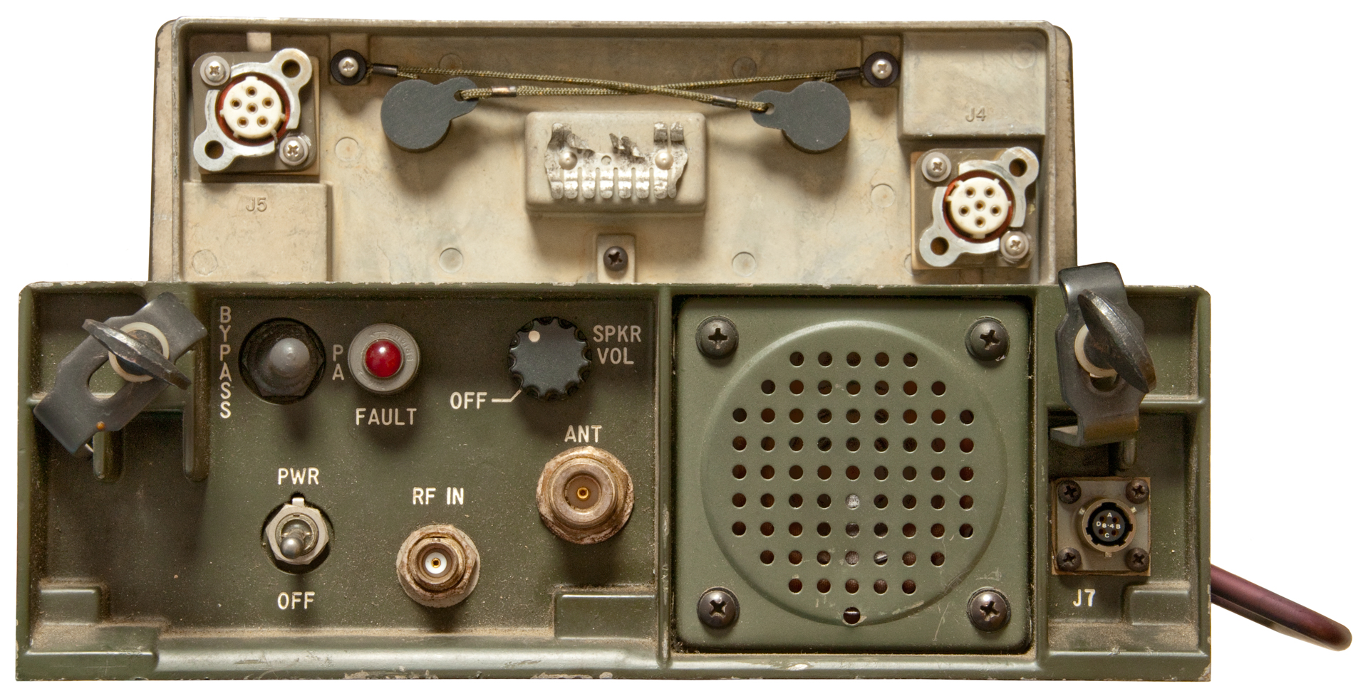 This is a dual band RF power amplifier that works with the RT-1319 to amplify either the VHF AM aircraft band or the UHF AM aircraft band. It has a panel that looks like the battery box for the PRC-113 radio with two battery sockets to provide DC power to the radio. The radio front panel antenna connector has a jumper that goes to the AM-7176 front panel so the AM-7176 has a T/R (transmit/receive) switch inside. There is also a loud speaker in the AM-7176.