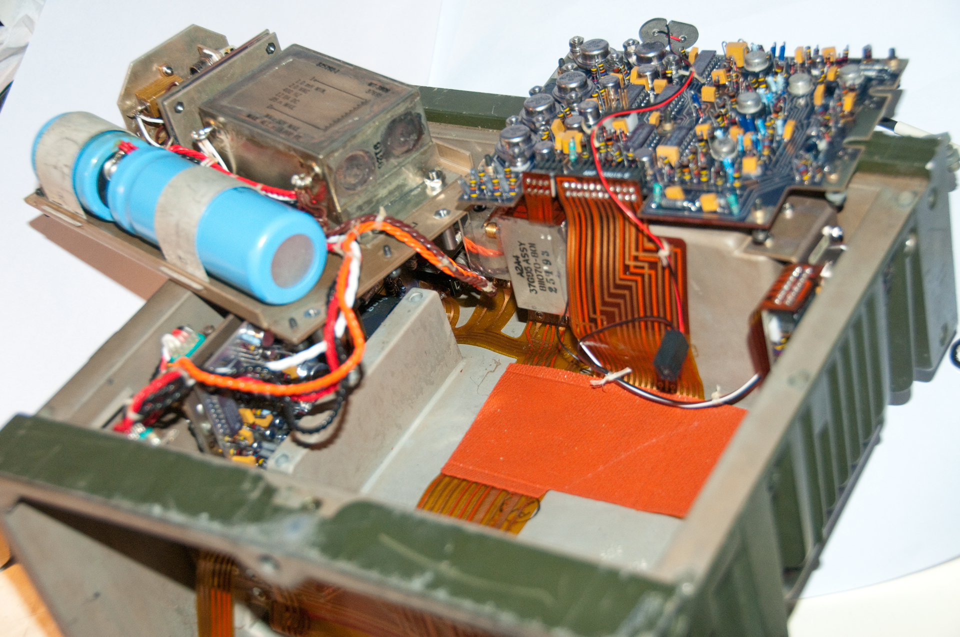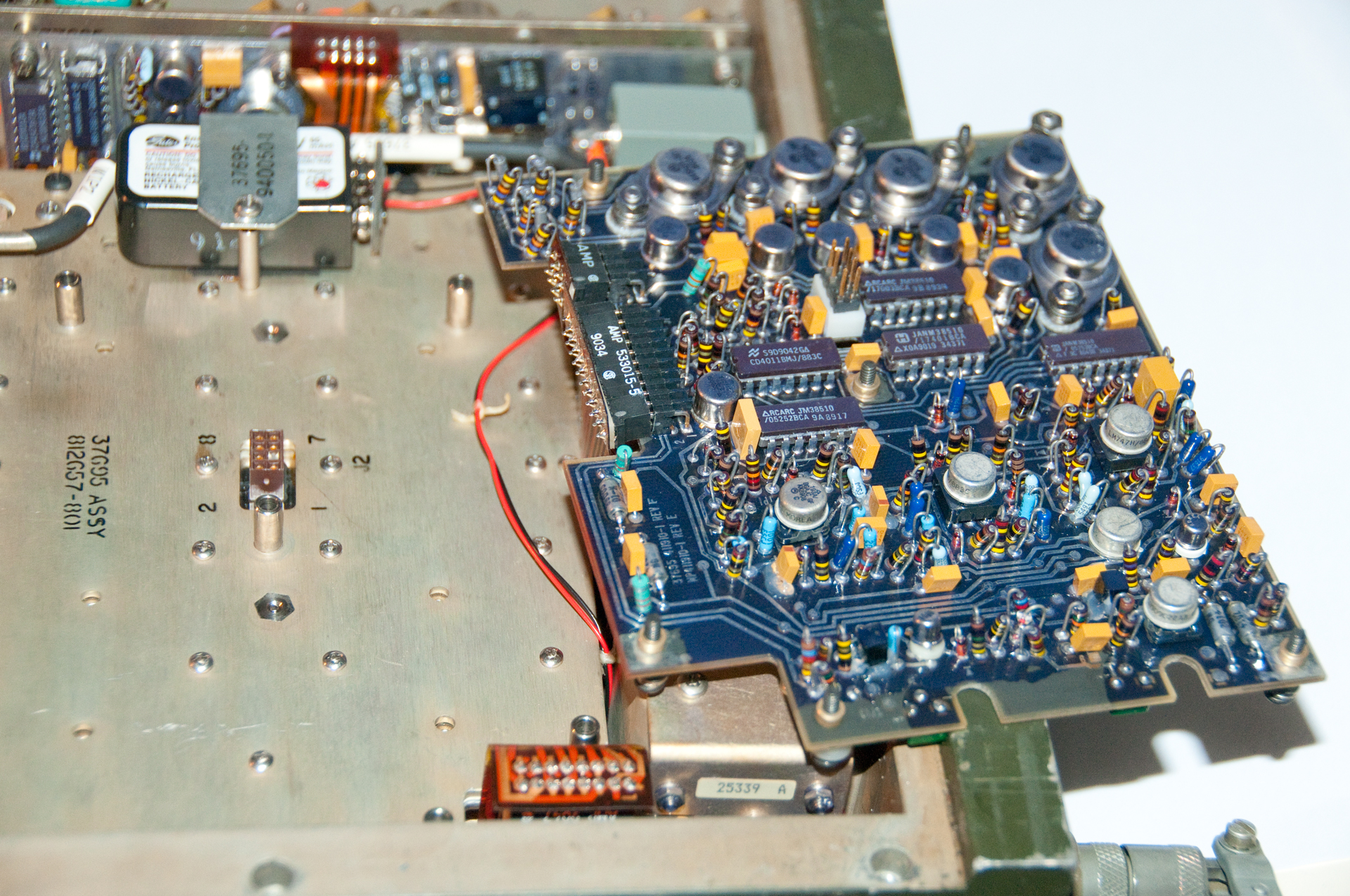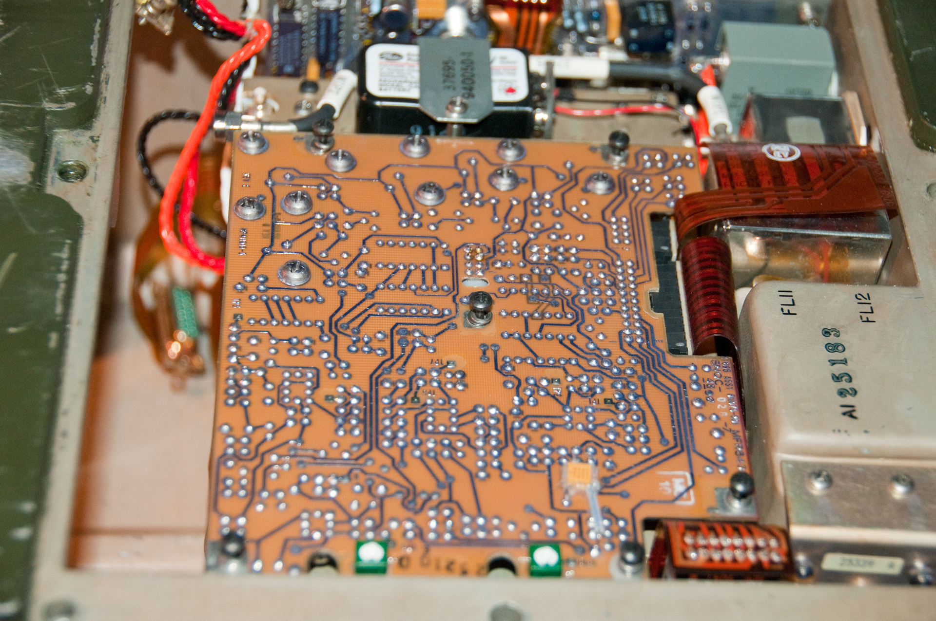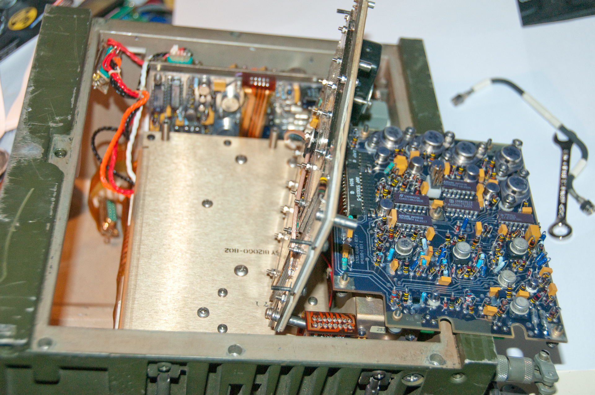 This is a dual band RF power amplifier that works with the RT-1319 to amplify either the VHF AM aircraft band or the UHF AM aircraft band. It has a panel that looks like the battery box for the PRC-113 radio with two battery sockets to provide DC power to the radio. The radio front panel antenna connector has a jumper that goes to the AM-7176 front panel so the AM-7176 has a T/R (transmit/receive) switch inside. There is also a loud speaker in the AM-7176.