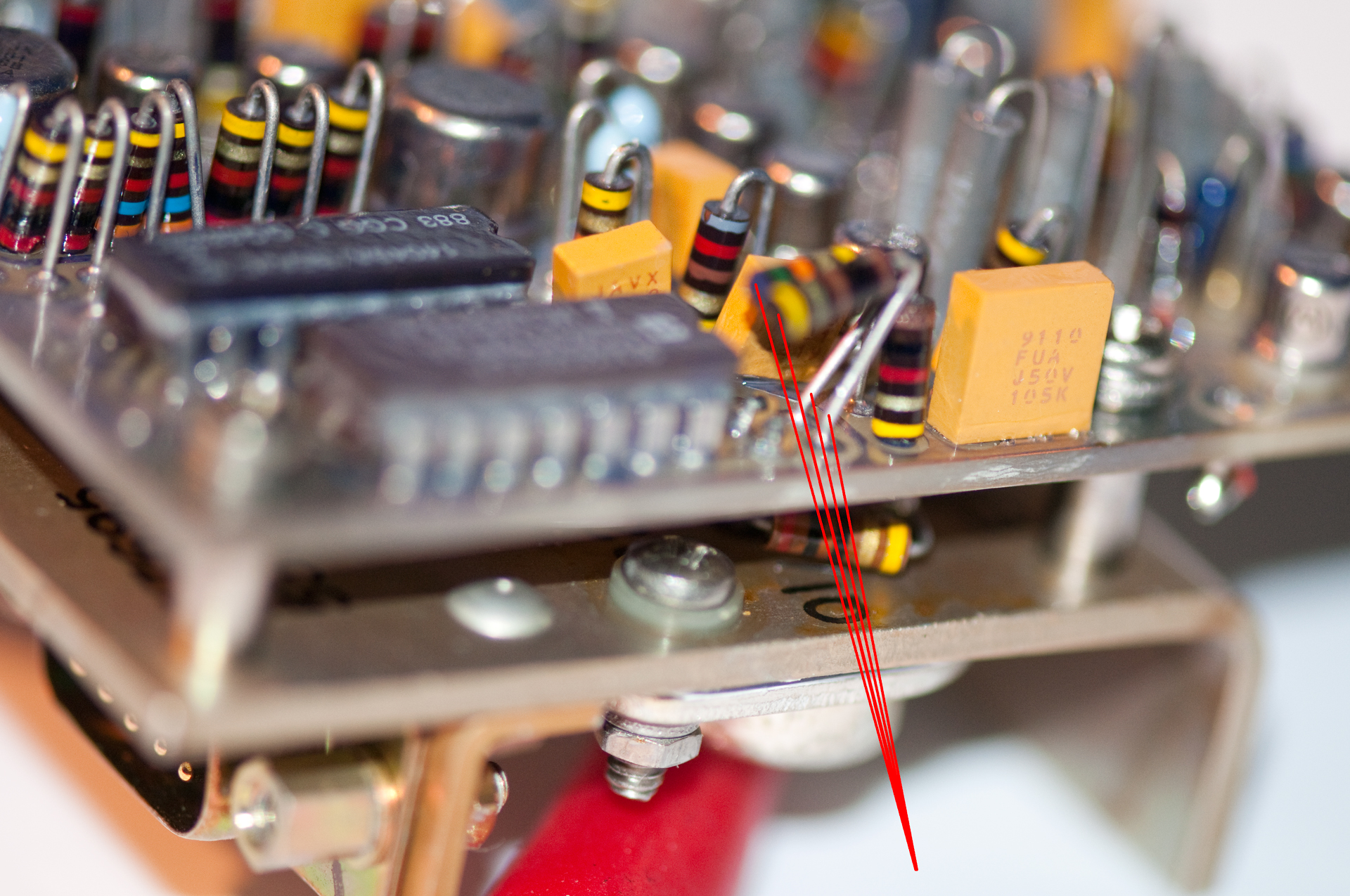 R21 (1oo Ohms) & R22 (75k Ohms) next to U1 have been broken off. Replaced with single 100 Ohm and series combination of 56K + 22K = 78K Ohms.
