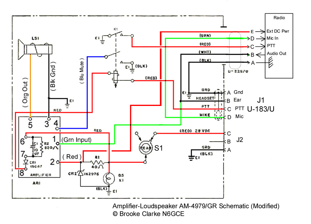 Pin # Function Internal wire color External wire color goes to 1 Input Green Green Radio AUDIO B 2 + Supply Red Red Cathode of 12 V Zener 3 Ground Black Black Ground 4 Mute Blue Blue Relay K1 Blade 5 Output Orange Orange Speaker 6 terminal N.C. Red C1 7 R2 7 terminal N.C. n.a. C1, R2 & CR1 Anode 8 terminal N.C. Red CR1 Cathode & Relay K1 coil Circuit Diagram inside lid, Circuit Diagram Modified for Ext Pwr to Radio