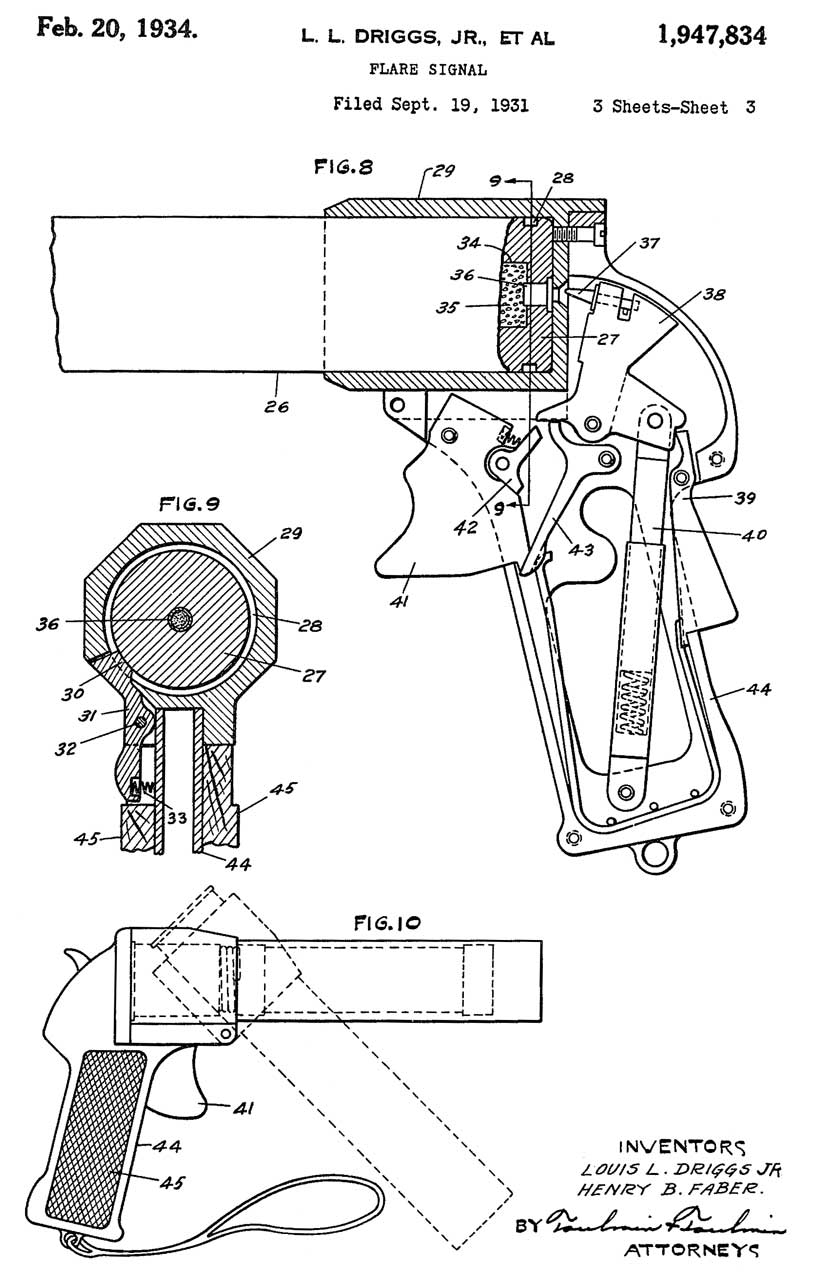 1947834 Flare signal, Jr Louis L Driggs, Henry B Faber, 1934-02-20, - pistol & Cartridge