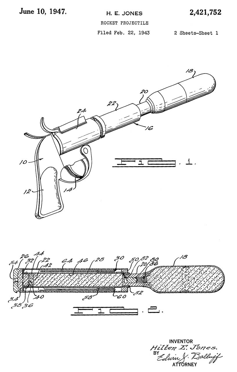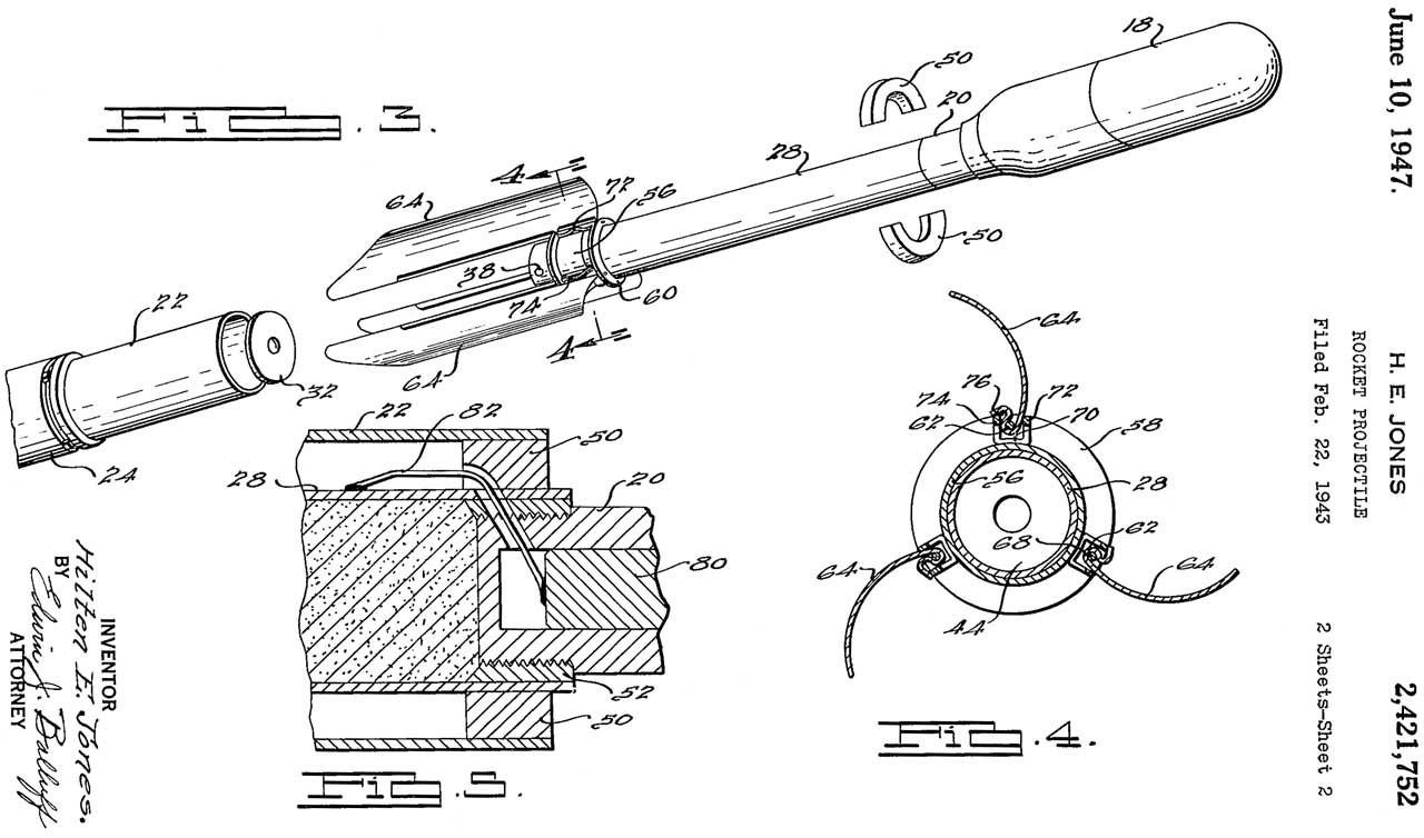 2421752 Rocket projectile, Hilten E Jones, Eureka Williams Corp, App: 1943-02-22, W.W.II, Pub: 1947-06-10, -
