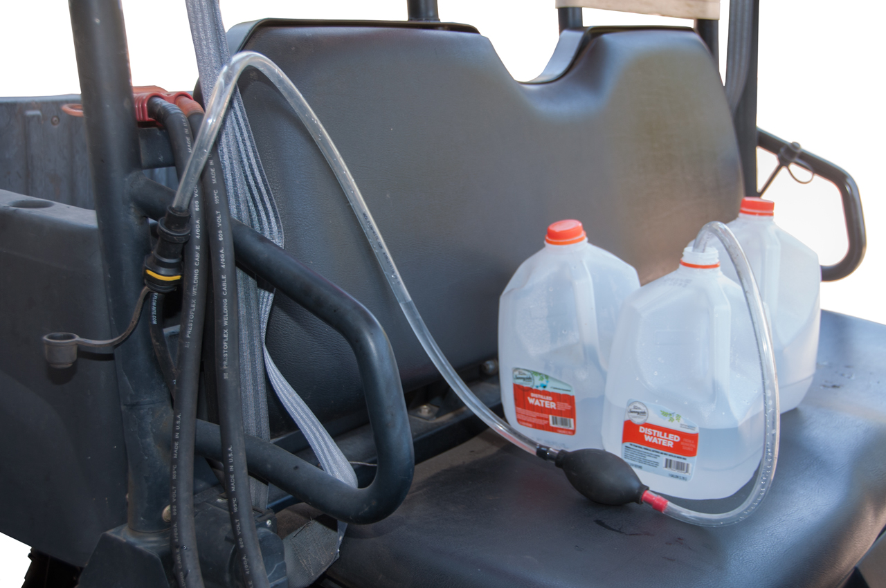 Smith Indian 5 Gallon Backpack Fire Pump - very good at conserving water, but the filled tank weighs 52 pounds, more than I want to carry, hence installed on hand truck. Could also have a custom bracket for installation on the Ranger EV. An alternate would be to add a fitting to the tank so the only the Smith Indian hose and hand pump were on the ATV. Each way has it's advantages.