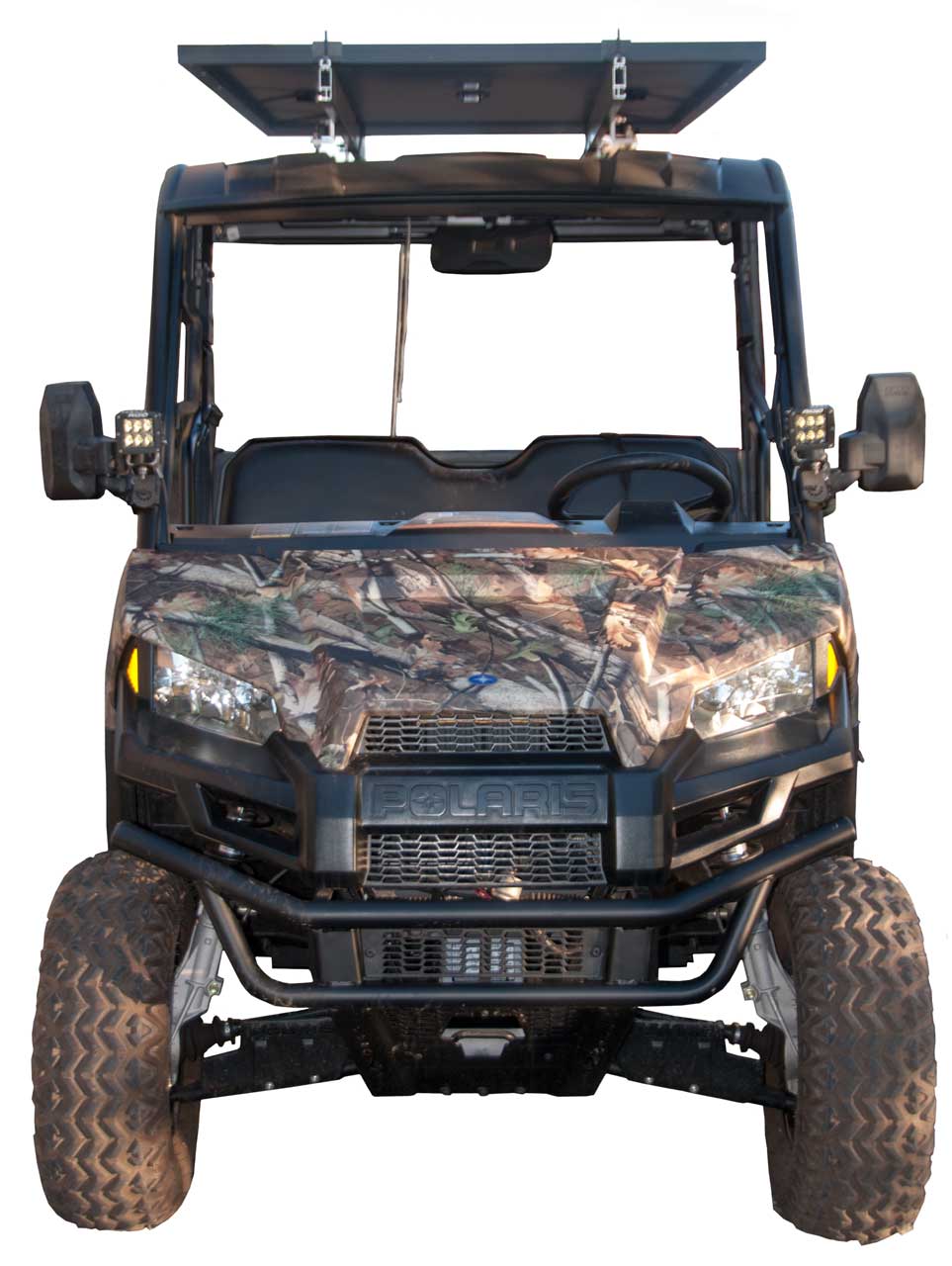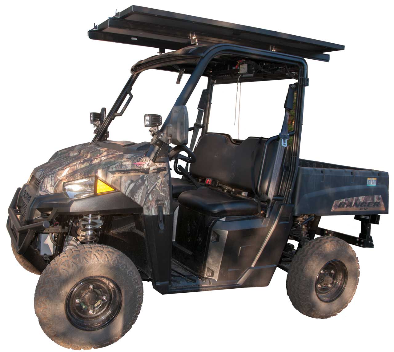 Solar charging the Polaris Ranger EV - has 6 house roof 255W panels, 120V 1530W system or 4 panel system on Ranger EV roof. Polaris Off Road - Ranger - Ranger EV -