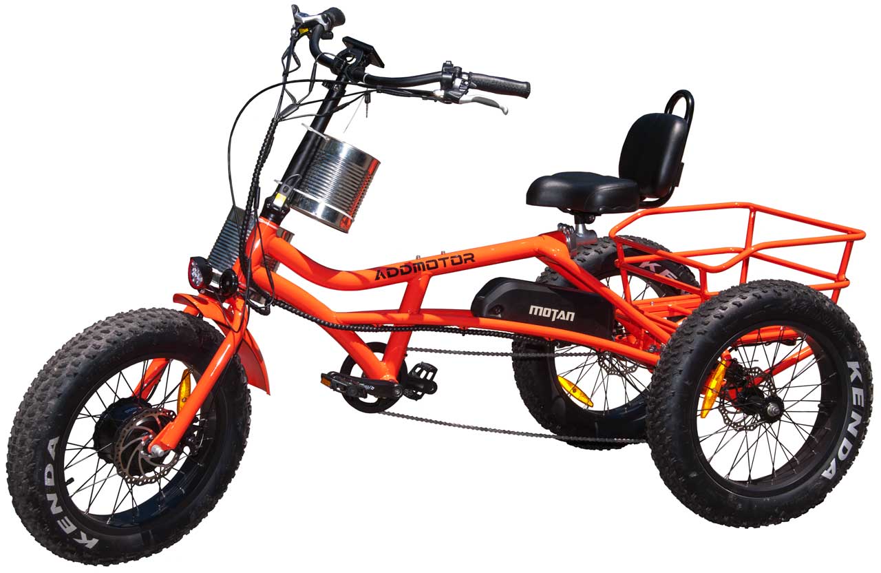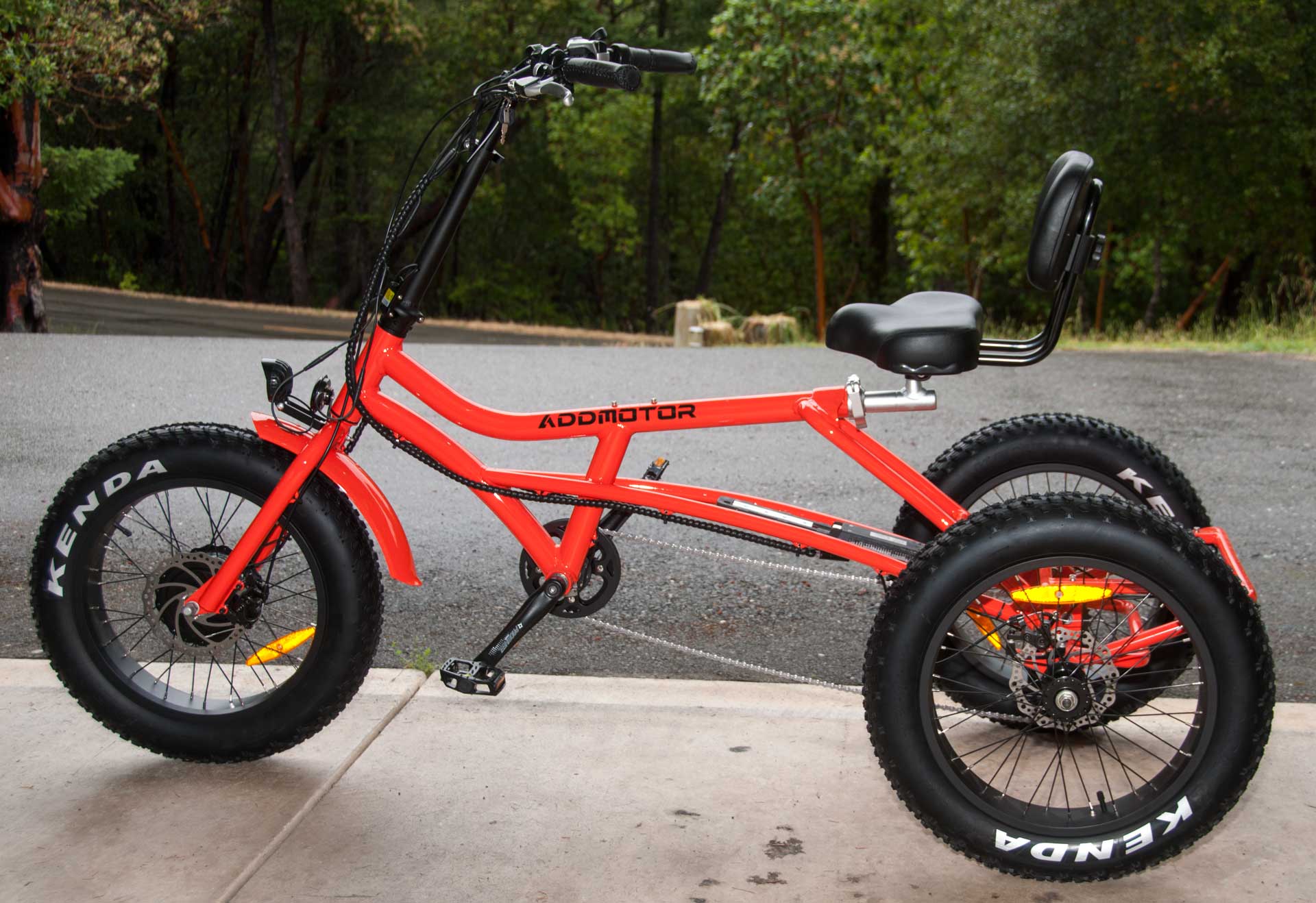 A series of Fat tire (Wiki) tricycles by AddMotoR includes the M-330 (YouTube Nov 27, 2018, Glider Launch Aug 2018)). and the newest version that is going to be offered for sale in about a week, the M-360. The M-330 and M-350 look very much like the existing adult tricycles with an added motor. The M-360 is a new lower design that's considerably more modern.