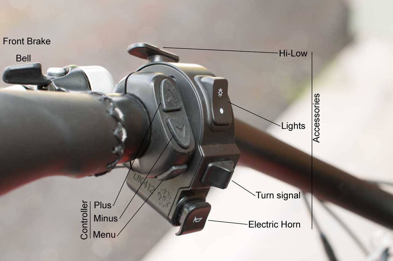 See Fig 26. Front brake lever, bell; Controller: Menu, Minus, Plus, Accessories: Electric Horn, Turn Signal, Lights On/Off, Hi/Low Beam