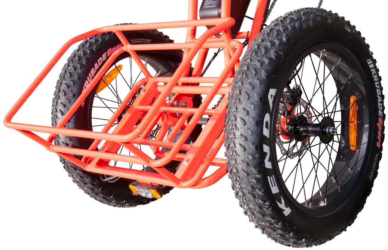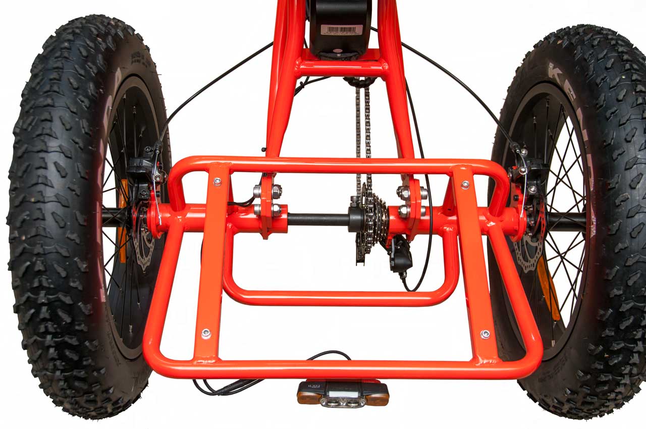 Looks like either a mid drive motor with added differential or dual rear wheel hub motors may be needed to get power to both rear wheels. Maybe adding weight to front wheel?