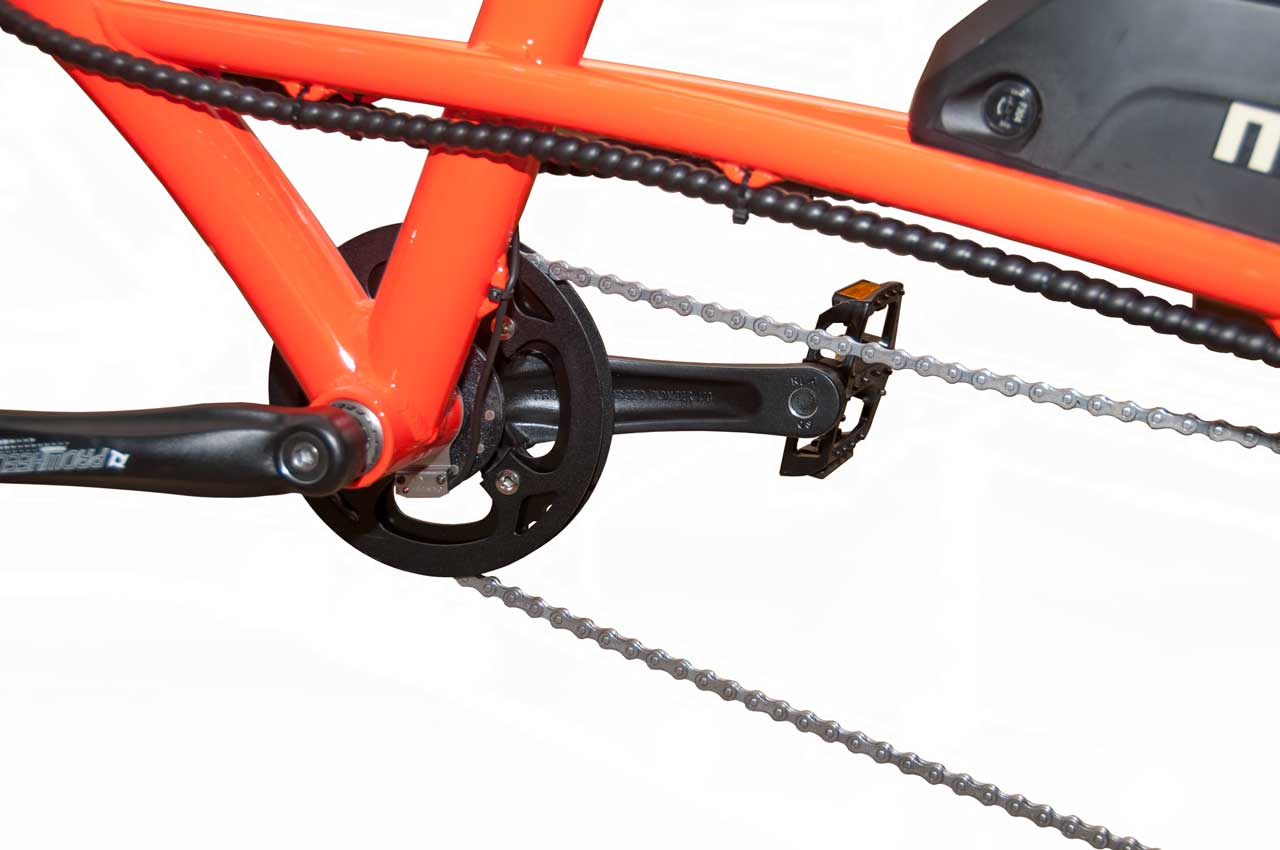 A tricycle with one steering wheel in front and two rear wheels (Wiki: Delta Trike). Only the right rear wheel is powered by pedaling. The front wheel has a hub motor rated 750 Watts powered from a 48V battery rated at 14.5 Amp hour capacity (48V * 14.5 Ah = 696 Watt hours; 696 Wh / 750W = 55 minutes running at full power, much longer at lower power levels). See Front Geared Hub Motor.