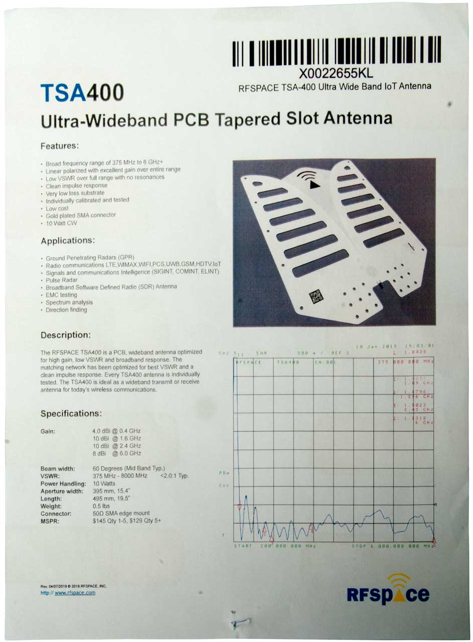 The TSA400 is on Amazon for $135.88, heading: "RFSPACE TSA400 Ultra Wide Band IoT Antenna 375 MHz - 6 GHz for UWB TX/RX SDR Radar IOT GPR SIGINT EMC Test ADSB WiFi FVP Drone Video Vivaldi Antenna (Wiki) "