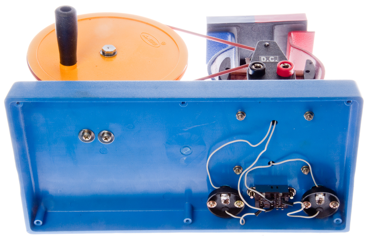 The hand cranked generator uses a circular rubber belt to speed up the generator. The generator consists of a couple of iron pole pieces topped with a permanent magnet. There are two commutator systems. In Fig 1 you can see the two AC brushes that make contact over 360 degrees of generator shaft rotation. In Fig 2 you can see the split disk commutator that reverses the polarity every 180 degrees. Fig 3 shows the wiring that's under the bottom cover plate. The 3-way switch is AC-Off-DC and connects the appropriate commutator output to a lamp.
