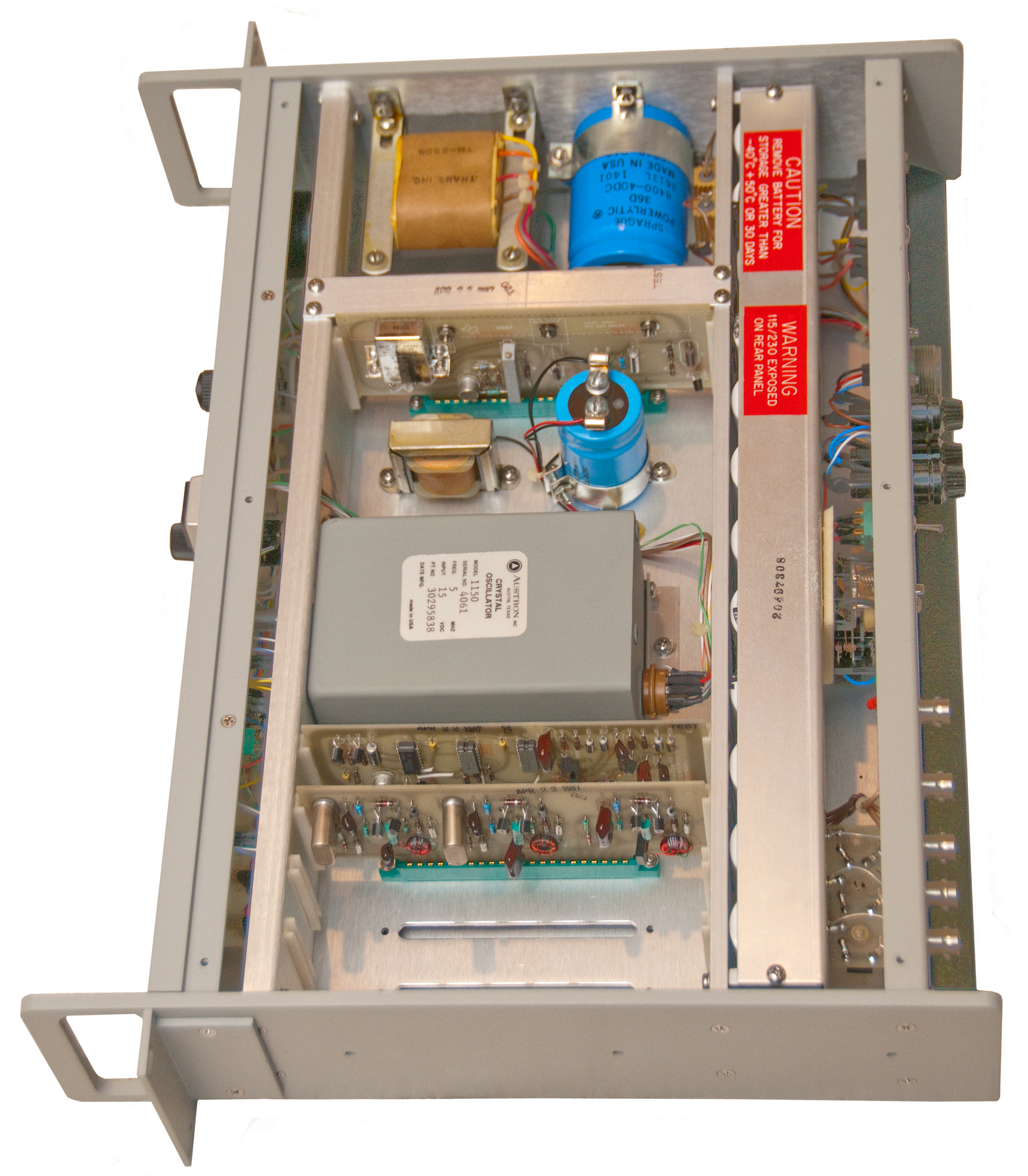 This is a rack mount 5 MHz frequency standard. In addition to the Austron model 1150 Five megacycle proportional controlled ovenized oscillator it contains a AC line power supply, provision for an external 24 Volt supply and an internal Ni-Cad 12 cell (14.4 Volt) battery pack with both trickle and charging circuits. There are also dividers to provide outputs of 1 MHz and 100 kHz. The chassis has a couple of unused card positions for other versions of the 1250 or maybe frequency standards with another model number? There is also an input for electrically tuning the oscillator. Note the front panel fine frequency control is a 10 turn pot which is driving the fine tune capability of the 1150 oscillator. The Coarse frequency control has a front panel cap the needs to be removed (which is for thermal stability) and then the tuning tool supplied with the accessories kit can be used to make coarse adjustments.