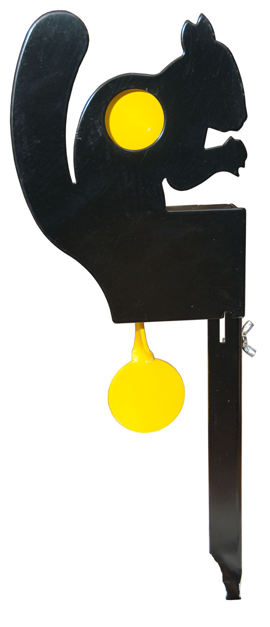 This is a pellet only target (.177 up to 1200 F/s or .22 up tp 950 F/s. When the main target is hit it falls back out of sight, when the lower reset target is hit the main target reappears.