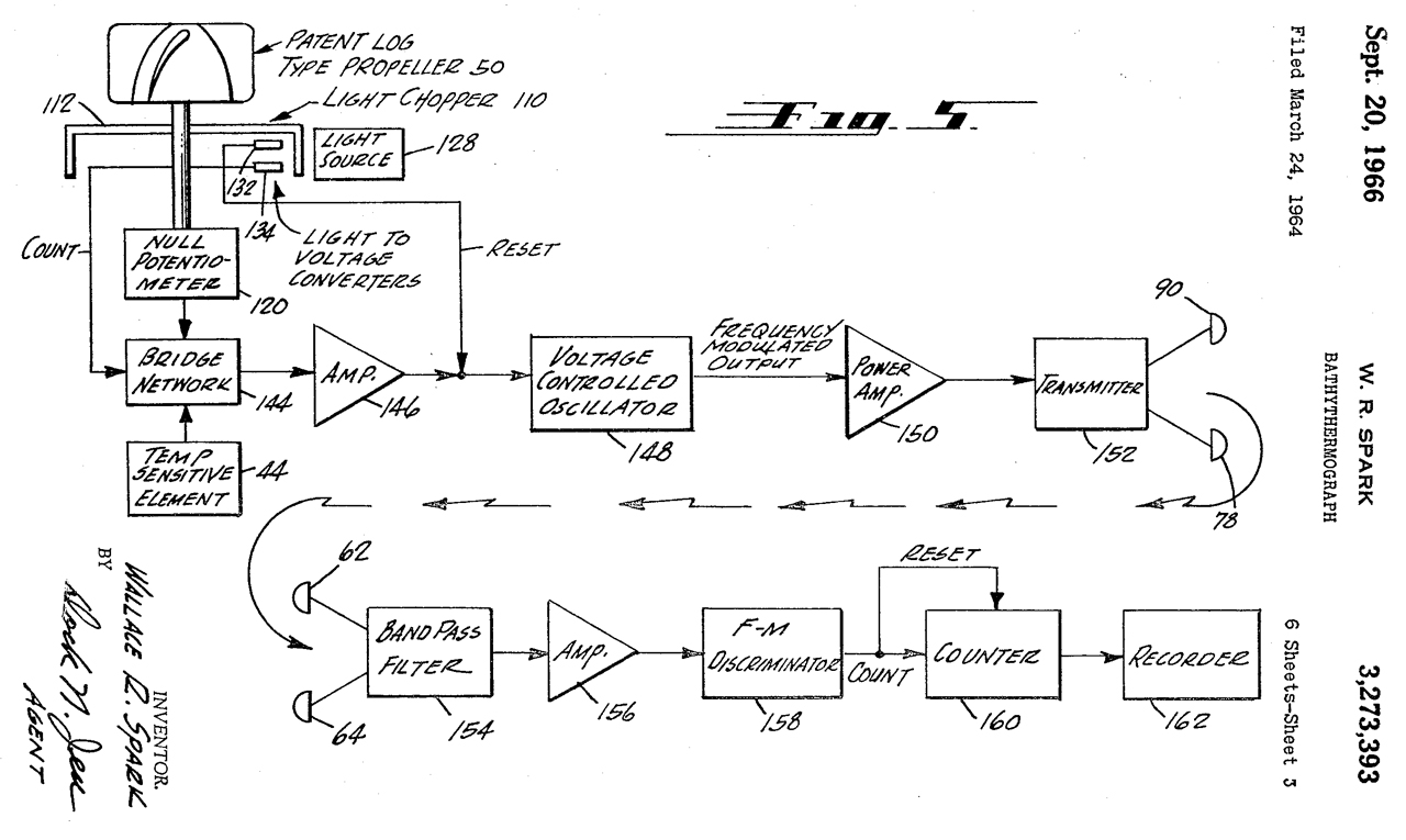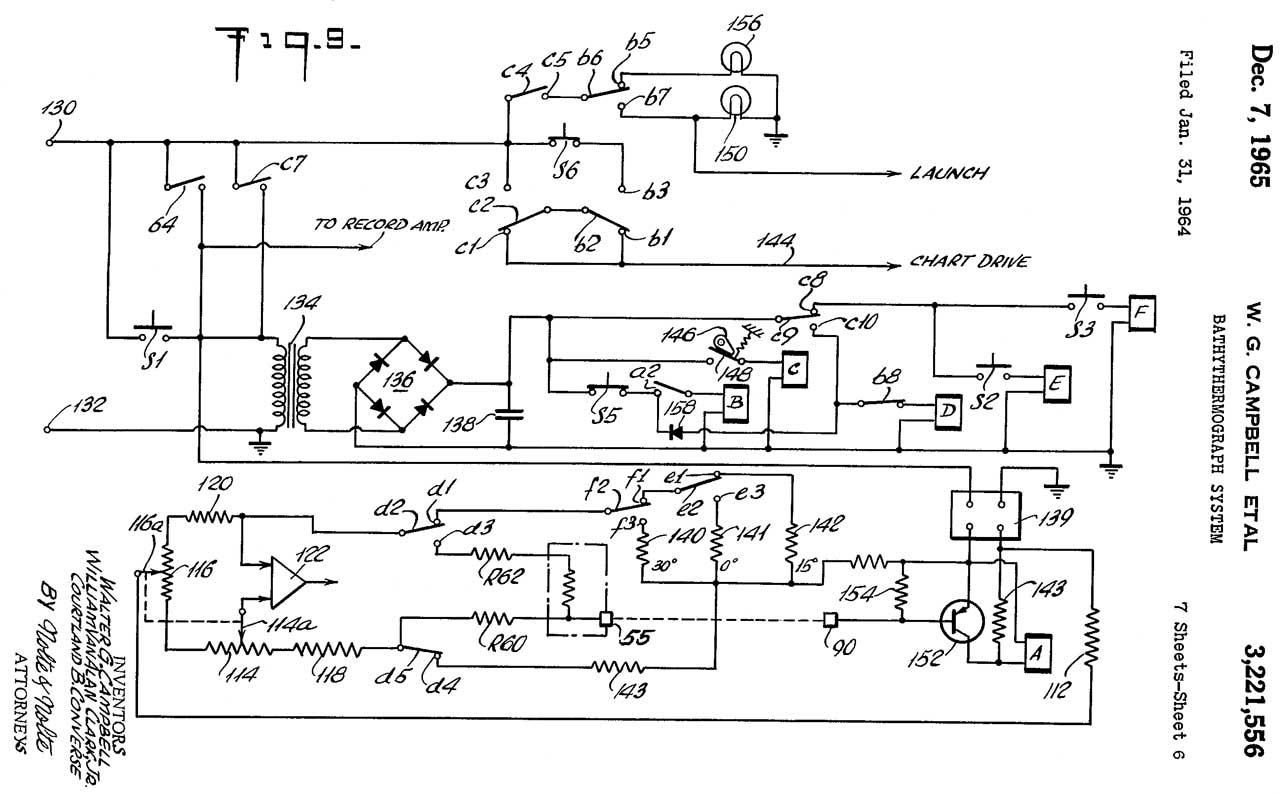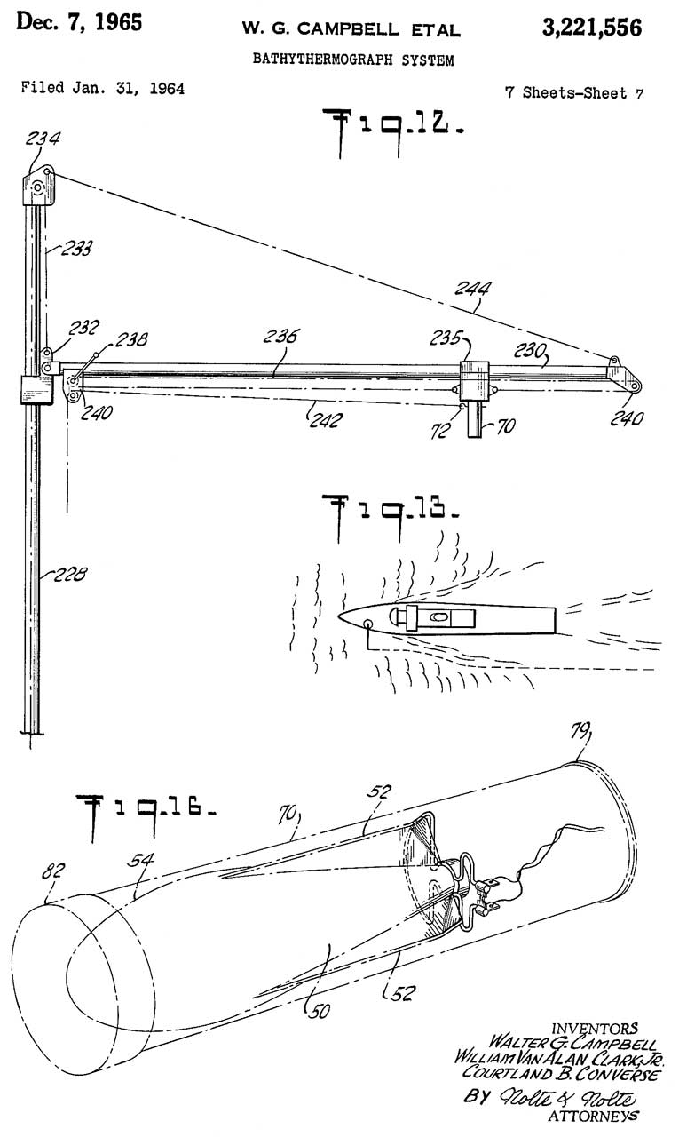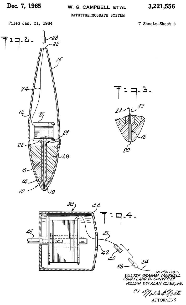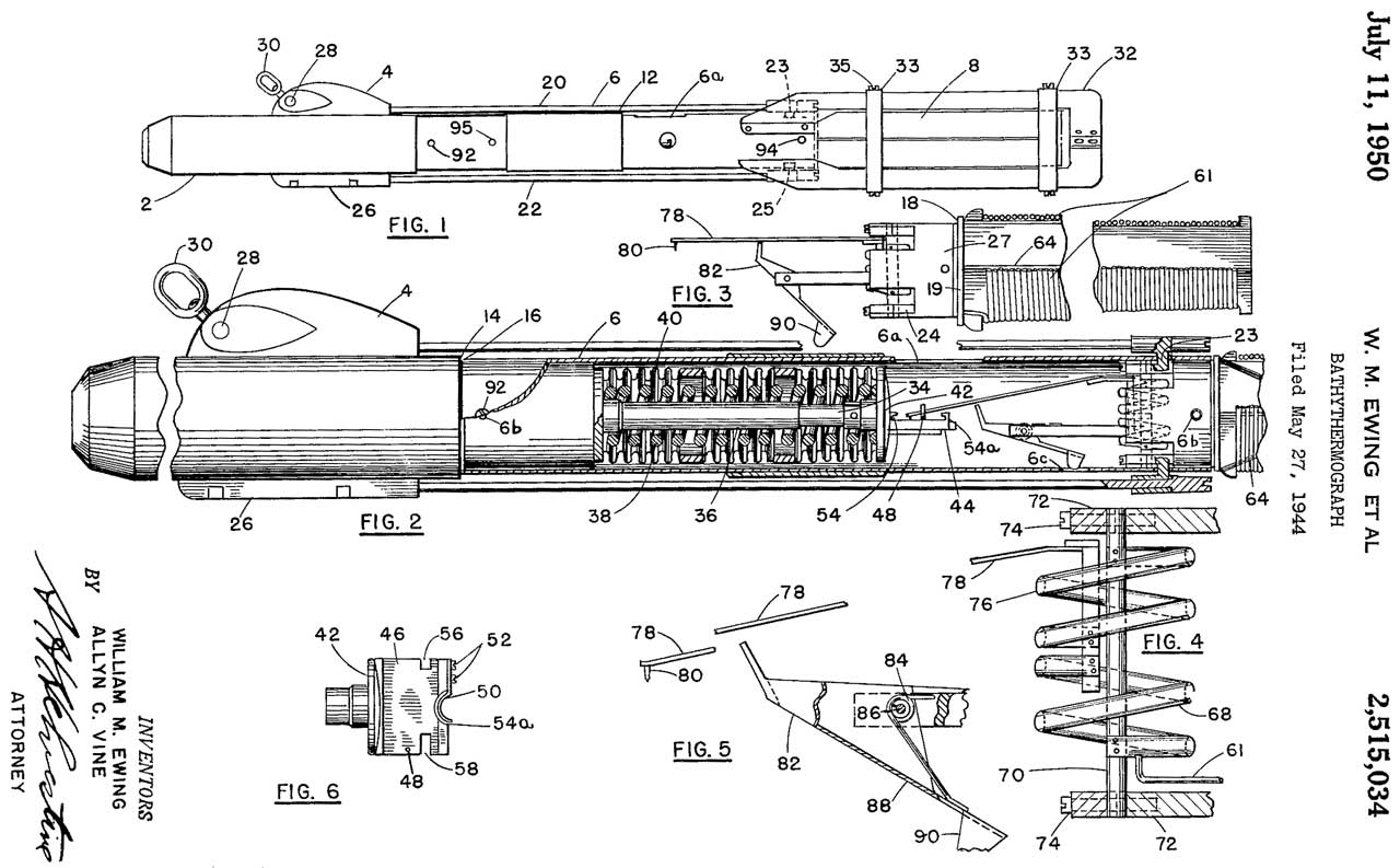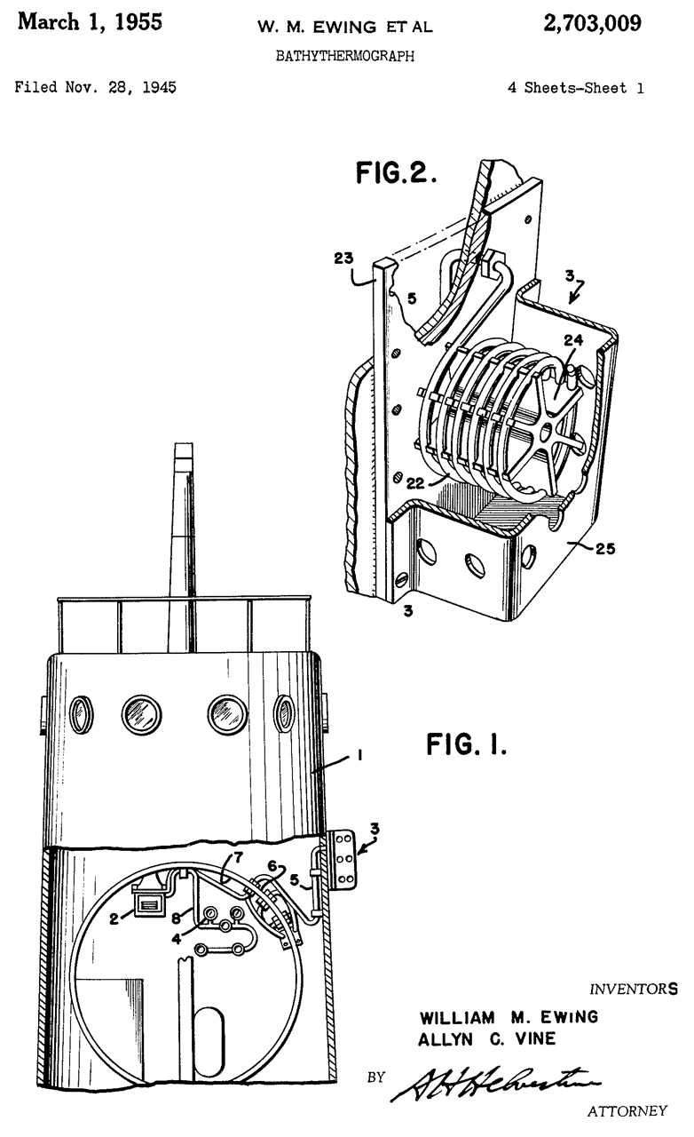 2703009 Bathythermograph, Ewing William M, Vine Allyn C, Filed: Nov 28, 1945, Pub: Mar 1, 1955, 73/178.00R, 346/120, 73/712, 73/742, 374/E01.3, 73/299 - for use on subs See above