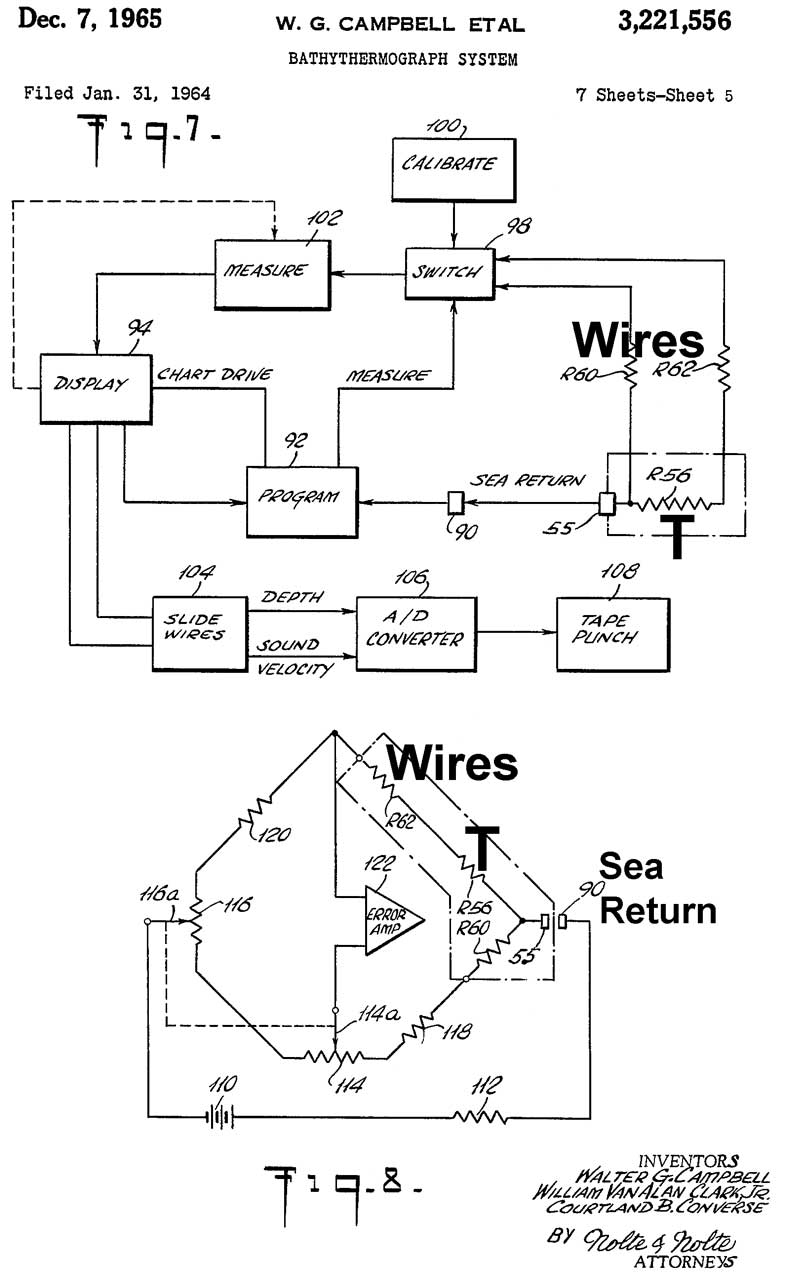 3483749 Bathythermograph system, Samuel A Francis, Sippican Ocean Systems, 1968-07-22, improves on 3221556 by using a current source and using both polarities in order to cancel out the resistance of the wire and sea water paths so more accurate.