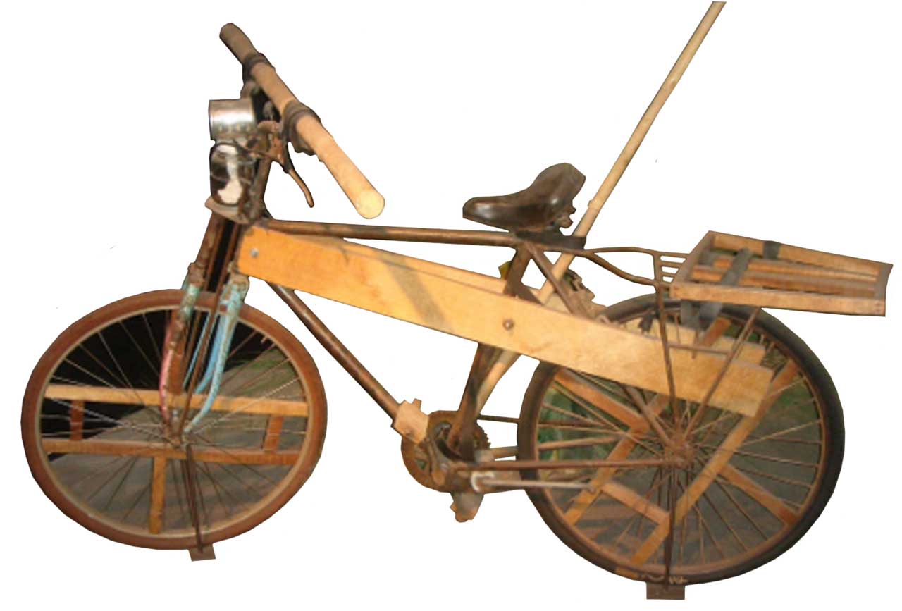 Based on a Peugeot bicycle reinforced to carry 450 pounds.