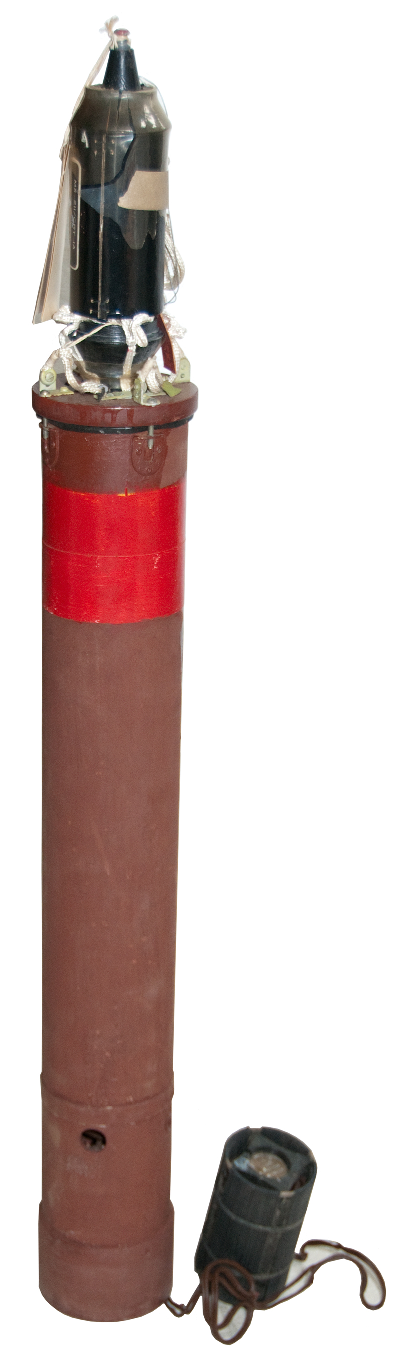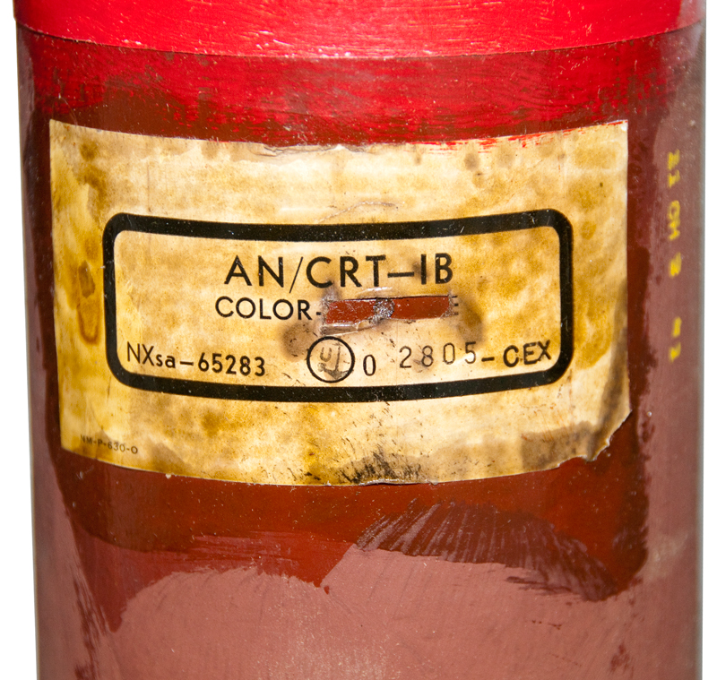 Surrounding the antenna at the top is a black plastic cylinder about 6" high and 2-5/8" diameter inside of which is a coiled up synthetic rope which I guess was attached to a parachute prior to deployment from an airplane. It's marked MX-211/CRT-1A. Note the "A" was not changed when the sonobuoy was upgraded.