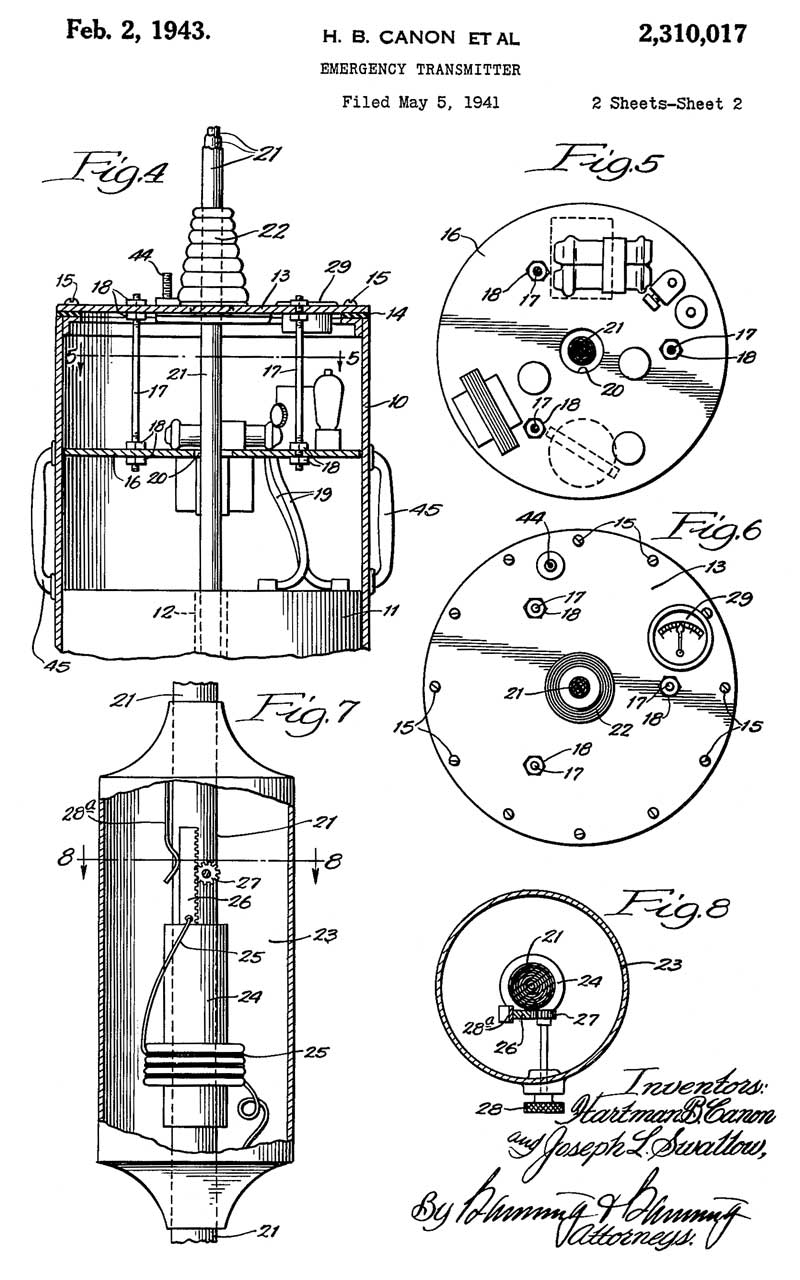 2310017 Emergency transmitter, Hartman B Canon, Joseph L Swallow, Gard Well Co, Wells-Gardner, App: 1941-05-05, W.W.II, Pub: 1943-02-02, -