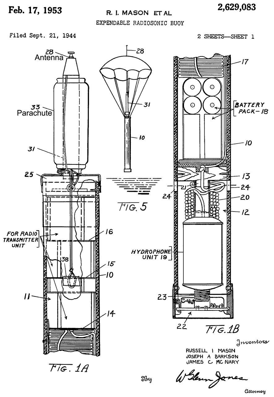 2629083 Expendable radiosonic buoy, Barkson Joseph A, Mason Russell I, Mcnary James C, Secretary of the Navy, Filed: Sep 21, 1944, Pub: Feb 17, 1953, 367/3, 343/709, 455/99, 441/33, 441/23, 343/705, 343/901 -