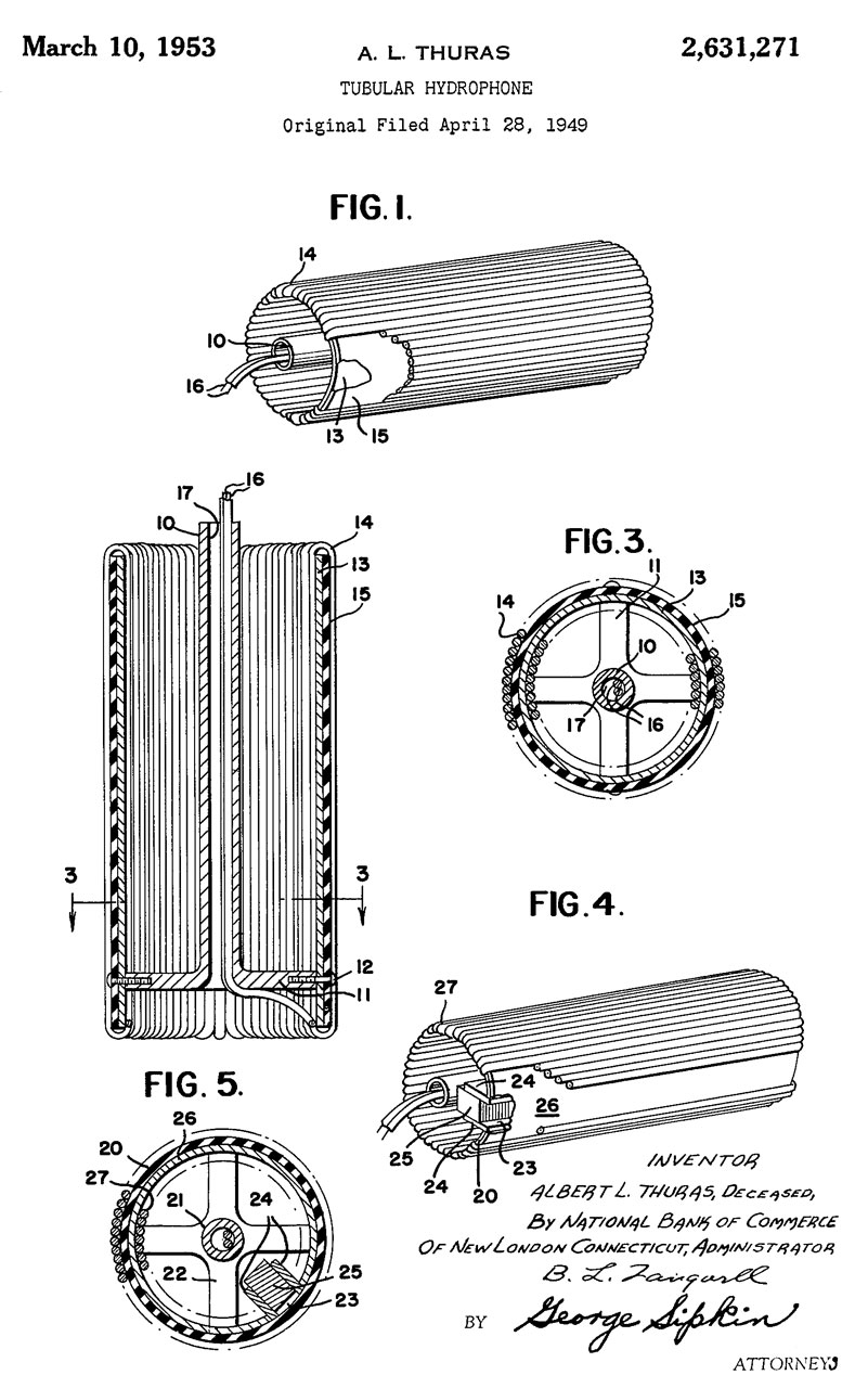 While learning about SOSUS (Wiki) and Frederick Hunt (Wiki) I found Hunt's patent for the Navy describing how to wind the Nickel core for the CRT-1 hydrophone. One of the co-inventors on patent 2666192 turns out to hold many patents for the Mk 24 Mine (Wiki) which is an acoustic homing torpedo. The other names on that patent are: