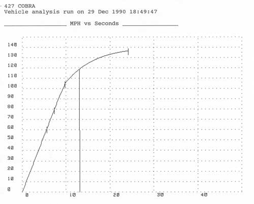 It is difficult to find out what the top speed is or could be. In order to learn more about this I wrote a computer program to analyze a car accelerating in a straight line. The basic idea is F=m*a (Wiki). This is solved in steps of 0.1 seconds AFAICR. The inputs were torque and RPM information on the engine, the transmission ratios, drive tire rolling radius, the rear end ratio, the frontal area and coefficient of friction and the rolling friction of the tires (only important when they are or are about to smoke). I tested this by talking to friends who were involved in drag racing. This taught me to also add more information about the wheel width and wheel diameter. This allowed for "tire growth" to be taken into account. After that modification the program did a very good job of predicting the acceleration and top speed. It turned out that the 427 Cobra that I have is RPM limited rather than HP limited. That is to say that the engine can not turn any faster at about 136 MPH and that limits the top speed, not a lack of HP. If taller (lower numerical) rear end gears were installed the top speed would be between 150 and 160 MPH, but the acceleration would be slower. I have opted to leave the rear end ratio as it is. I had a friend with a movie camera (no camcorders then) film with a stop watch taped to the instrument panel as I accelerated to 100 MPH and then braked to a stop. Zero to 60 MPH (in first gear) was less than 4 seconds and the total time to stop was just over 12 seconds. Even today these are respectable numbers.The following version is written in Hewlett-Packard Workstation Basic. pg1, pg2, pg3, pg4, pg5, pg6 - Output: Input Data & HP table, Time Table, Graph -