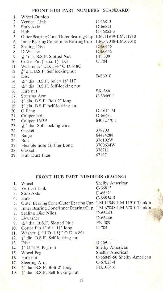The universal joints on the rear half shafts tend to wear out with hard driving. At first I got these directly via air freight form A.C. in England at over $50 each (1969). Once they were out of stock and to keep my car on the road sent me to my local BMC dealer to get Jaguar joints. BMC was was out of stock of their $25 joints and sent me to my local American auto parts store to get Ford pickup truck joints. These I got a less than $5 each. Note also that there is no water protection of the wheel bearings. If the car is driven in the rain, the wheel bearings will rust. I found this out since when I first owned the car it was my daily driver.