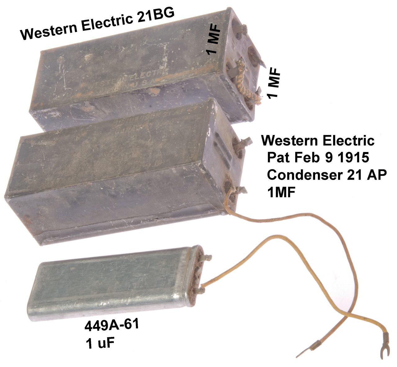 Western Electric 21 BG dual 1 MF 21 AP 1 MF 1127513 Paper Condenser, Feb 9 1915 575653 Electrical condenser, Jan 19, 1897 449A-61 1 uF |