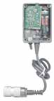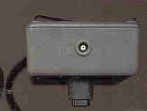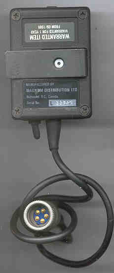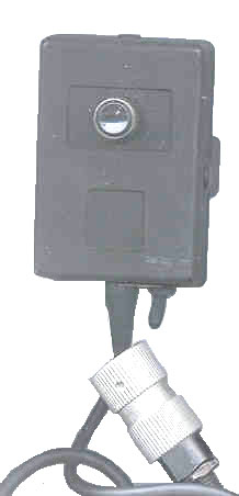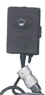 Control Box - with belt hook, PTT switch and "Hi Low" Microphone sensitivity switch. When in the Hi position you can whisper and easily be heard. The radio connector is the standard 5-pin U-229. The cord is 2 feet long. The PTT switch has a noisy action, you would not want to use it in a quiet environment. It sounds like a child's "cricket" noise maker. One of the optional Telex switches would be a better choice. The company that made this used to be called Magnacom (or Magnum Distribution in Canada) and was later bought by Telex.There may be two versions of the EM200 on the surplus market, one as shown here is the military version which has the radio cord permanently attached to the control box and the other a commercial version with the "EM200" label and a removable radio cord.