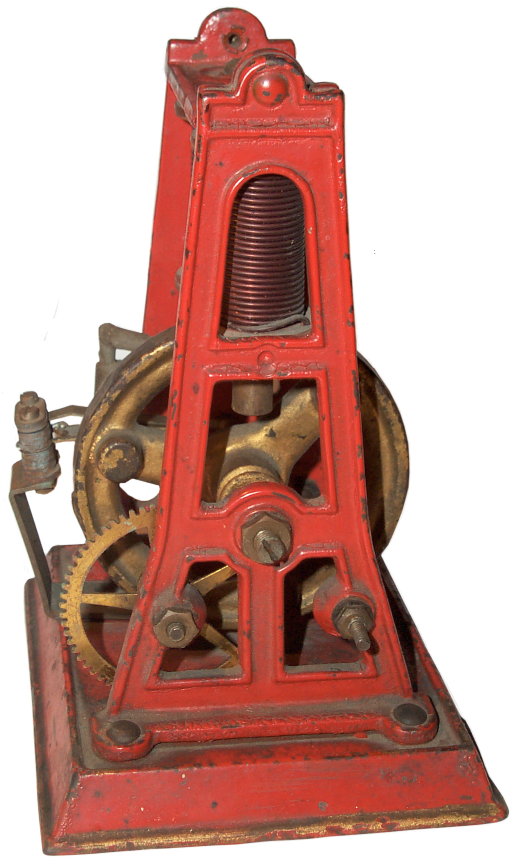 Arrived needing a cleaning and a little electrical repair.  The reversing lever was not fitted and the flywheel does not have the 4 pins (left & right bumps) shown in Fig. 6 as "r".  There are a number of improvements from the details shown in the patent.  For example this Toy Engine has 3 armature bumps on the flywheel and the patent shows 4.  Tubular rivets are used instead of screws and bolts.  Sending current through a moving joint is not a good thing.   This was found to be unreliable in clocks and I'm sure that's the case here.  The commutator leaf contact is similar to the Hourly Winding Switch in a Self Winding Clock Co. "Western Union" clock.