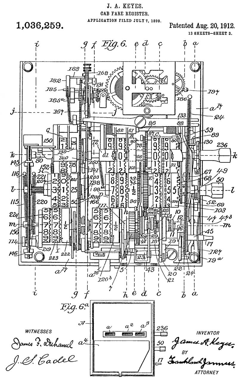 The application date was1899-07-07 and even then the mechanical complexity of the fare register was quite high. Note this includes both a distance based or time based fare system. It was only in later fare registers that they combined distance and time into a single fare.