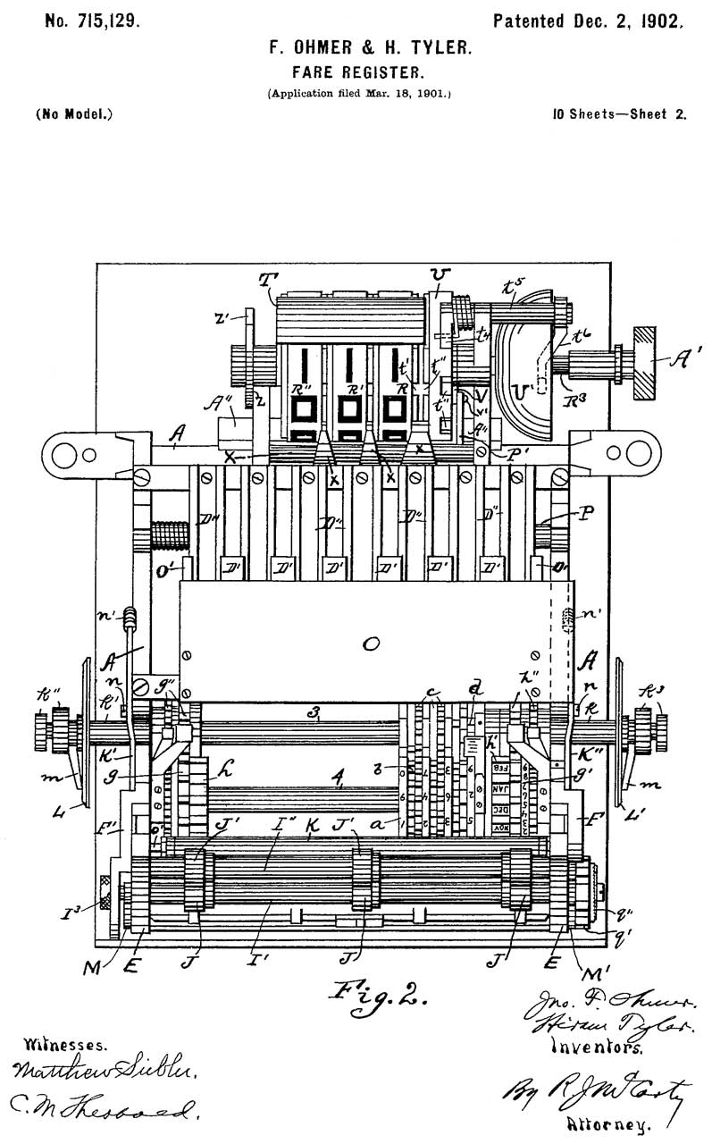 715129 Fare-register, John F Ohmer, Hiram Tyler, Ohmer Fare Regiester Co, 1902-12-02, -