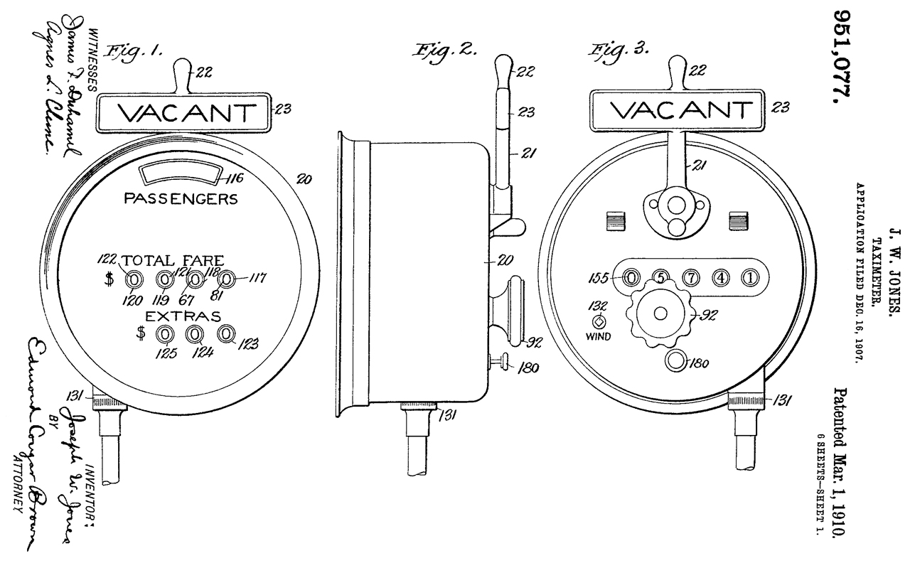 951077 Taximeter, Joseph W Jones, App: 1907-12-16, Pub: 1910-03-01, -