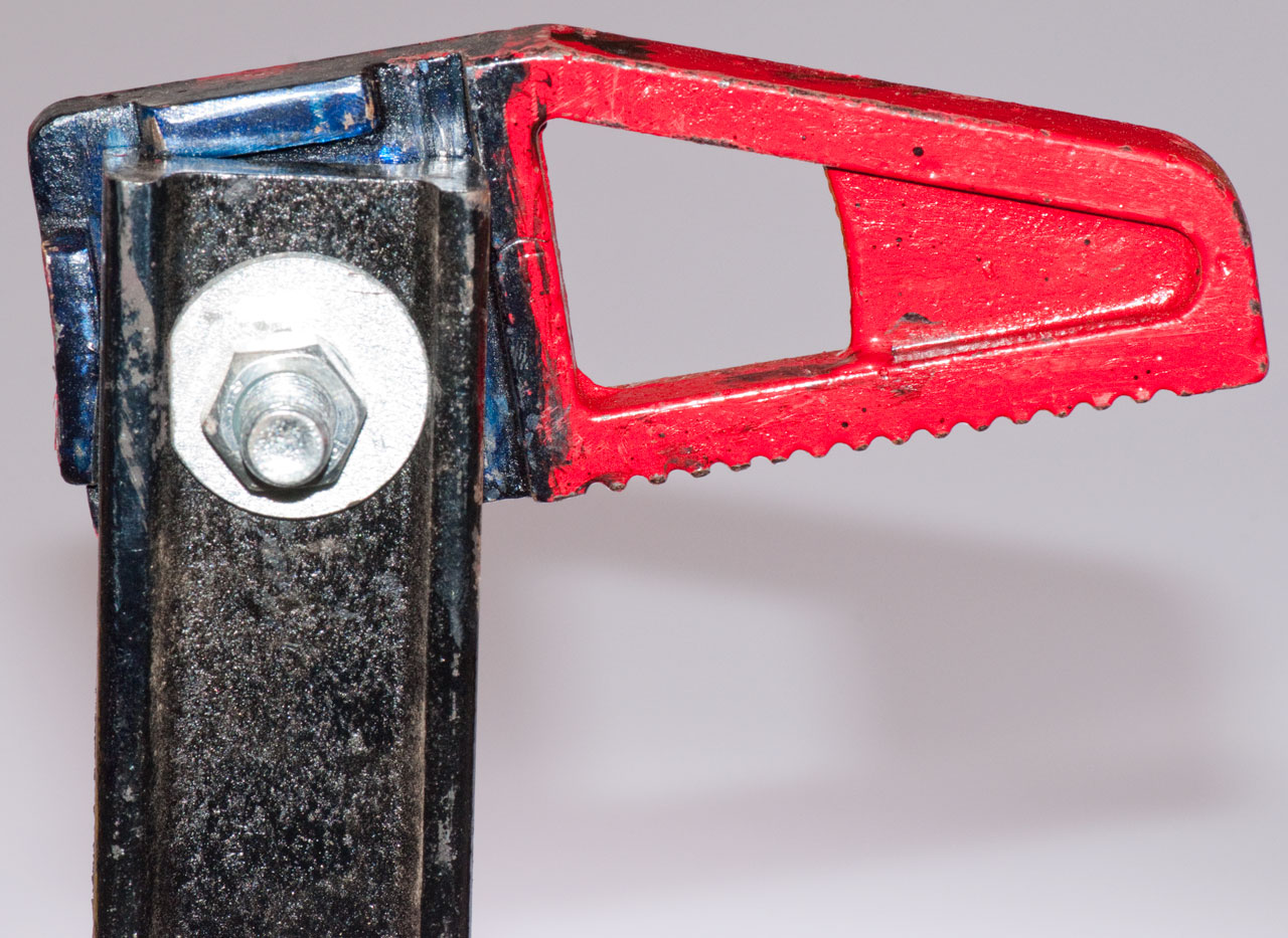 side is flush when in the up position. I'm going to take this one back and add a new longer bolt to replace the 42mm long x 12mm dia. - 1.75mm pitch bolt so that malleable iron washers can be used on both sides. Also going to grind the top jaw so it fits properly into the I-beam. Maybe a 1/2" bolt? |
