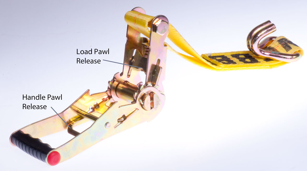 handle pawl and a load pawl. Once there's some tension on the strap the load pawl can not be retracted unless the handle is pulled enough to unload the load pawl. When starting out pass the strap through the slot in the axle and pull the strap so it's tight. Then just work the handle and after a half turn or so the strap will bind to the axle and then the handle will tension the strap. |