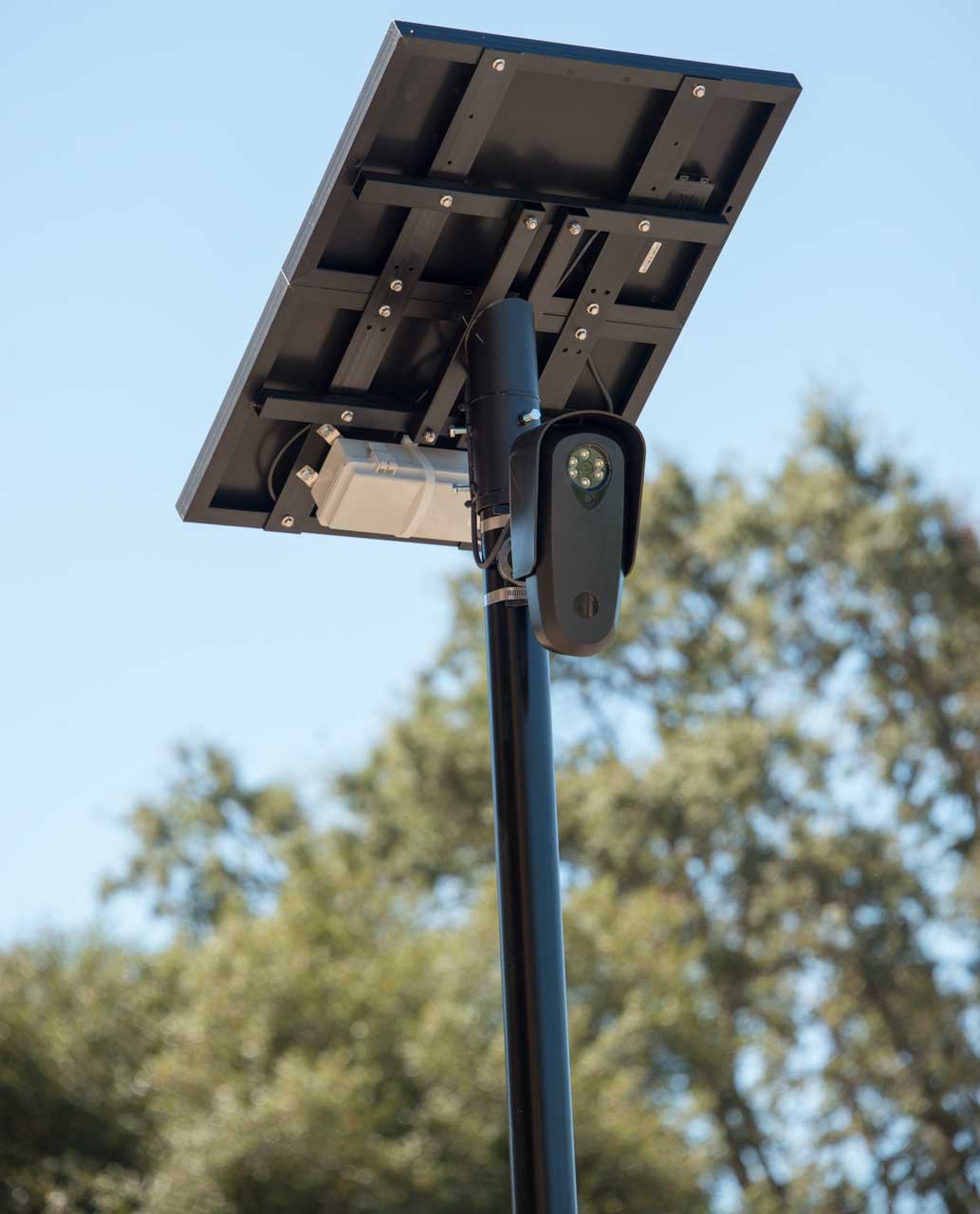 The key components are: Camera Housing containing a PIR movement sensor (Wiki), IR LEDs for night capture, a wide filed scene camera and a narrow field license plate camera, Solar Panel with an associated power supply and battery, Communication module with Real Time Clock that links to the base station processor by cell phone.