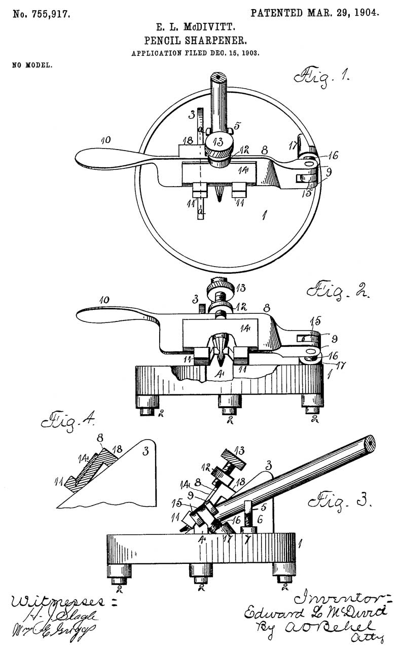 755917 Pencil-sharpener, Edward L McDivitt, App: 1903-12-15, Pub: 1904-03-29, -