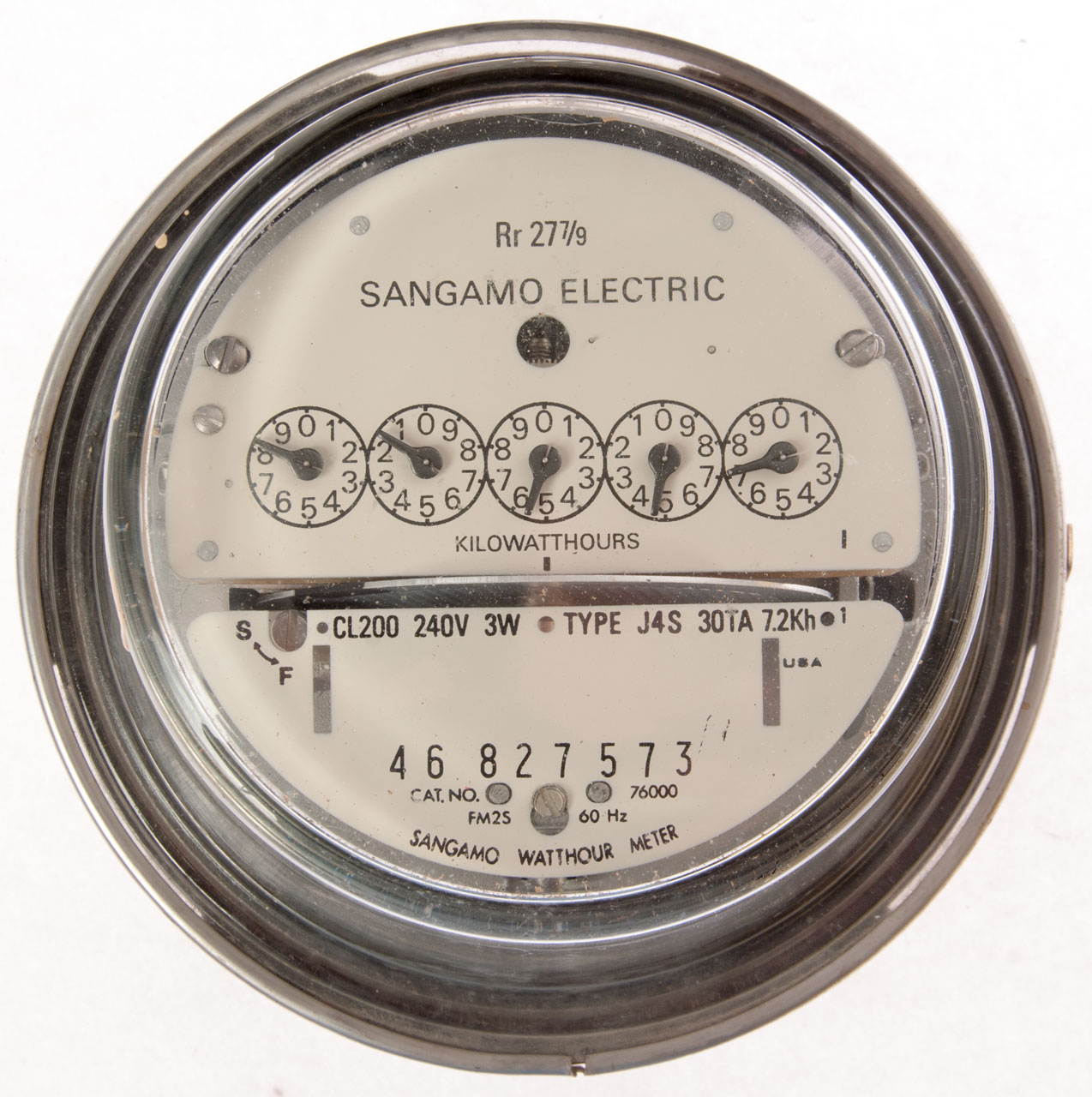 This is an electric utility meter of the type commonly used on single family houses. The input is 220 VAC from a center tapped transformer.