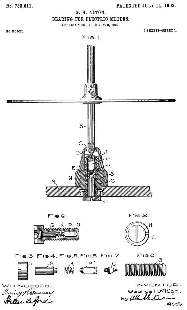 733611 Bearing for electric meters, George H Alton, Gen Electric, Jul 14, 1903, 384/246; 125/39 -