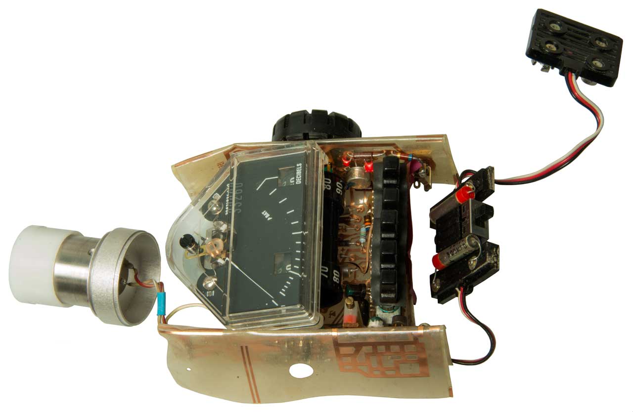 1565-C Sound Level MeterThis came in the Sound Level Measuring Set.The grill that protects the 0.938" diameter microphone has come loose. The white cap has General Radio embossed on end. With a pair of new 9V batteries it fails battery check. The meter moves when the Bat Chk button is pressed, even if the On/Off switch is in the off position. The batteries are are connected Red: +9 White: common ground Black: -9 The Switch assembly also has a couple of 300uF 10V caps across each of the batteries. The DPST switch works on the Red and Black wires. Both the Black and White wires from the battery block to the switch block are open.