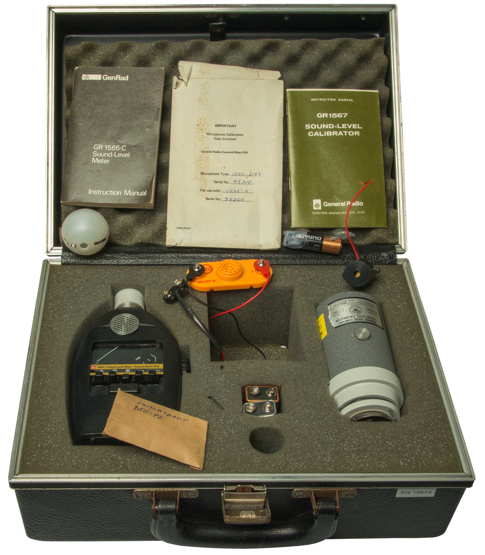 This set came in a 13" x 9-1/2" x 5-1/4" suitcase that included the 1565-C Sound Level Meter and GR 1567 Sound Level Calibrator, manuals for both instruments and a calibration plot of the 1560 microphone.