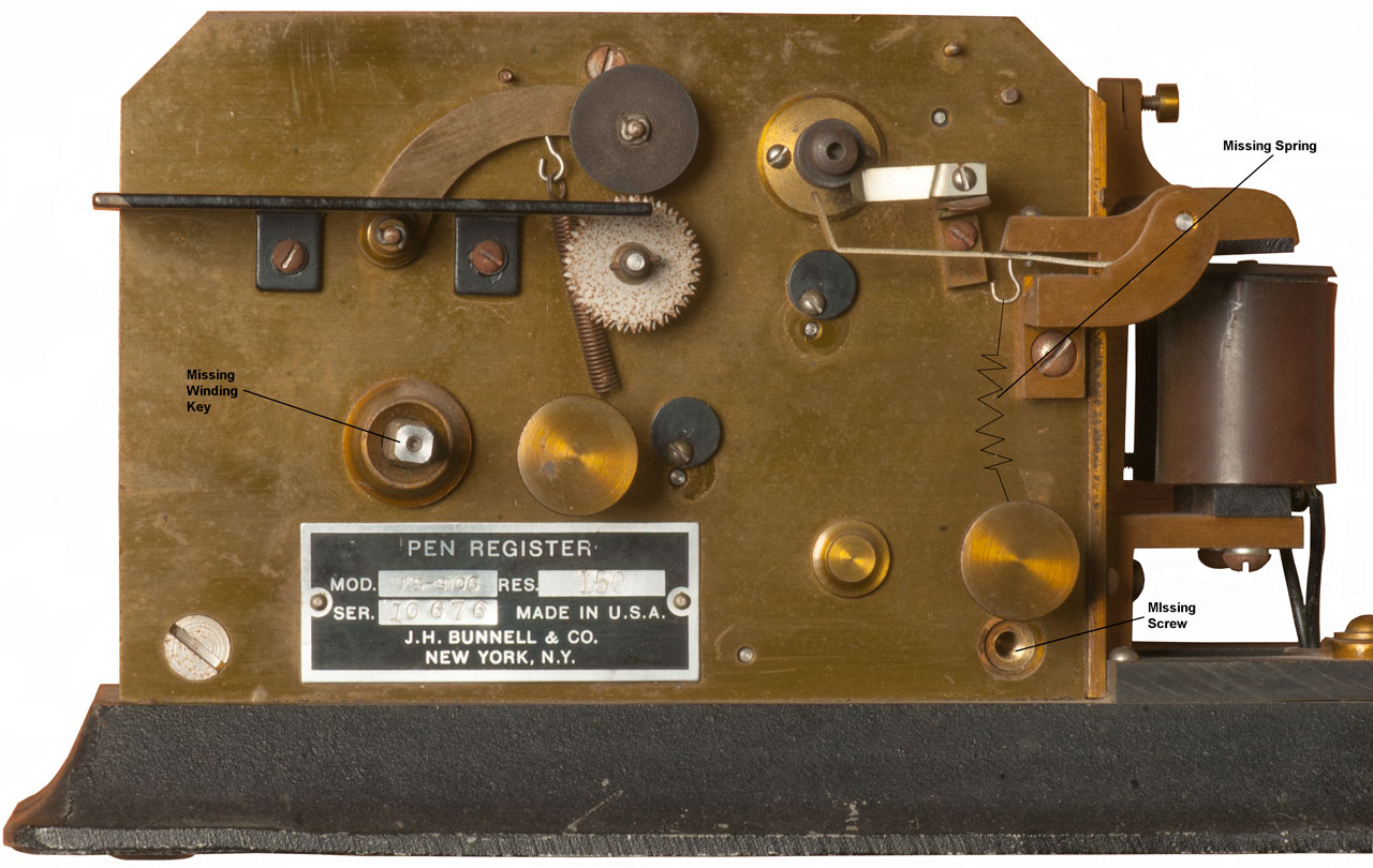 Strowger invents the dial telephone. It's not clear when, but the police find a new use for the pen register. When connected to a dial phone line it records all the outgoing numbers that were dialed. This was not public knowledge for many decades. The KS-3106 (single pen) and KS-3107 (dual pen) registers are intended for this application. Note "KS" indicates a Bell System specification, such as KS-8455 Telephone Lineman's "Kick Set".
