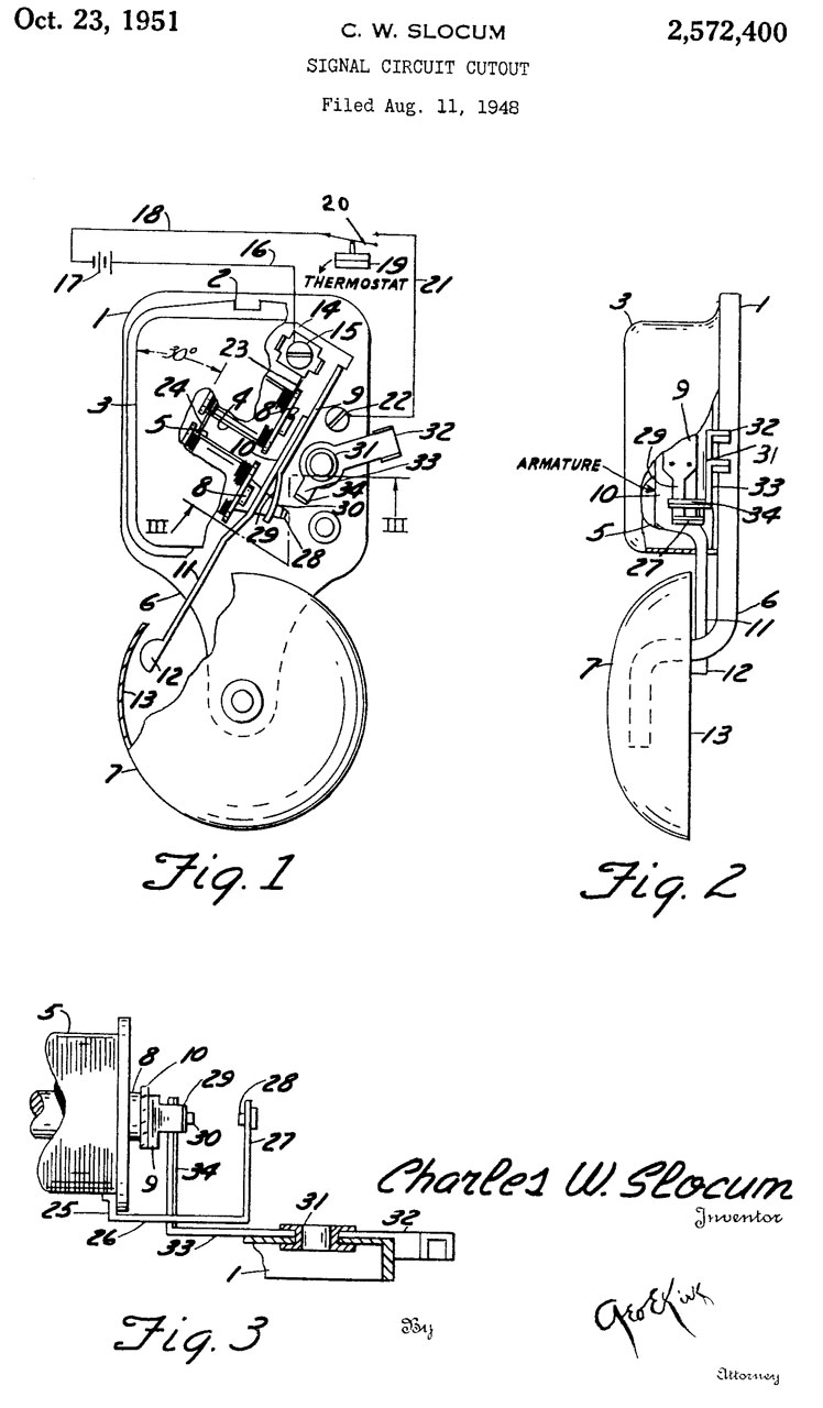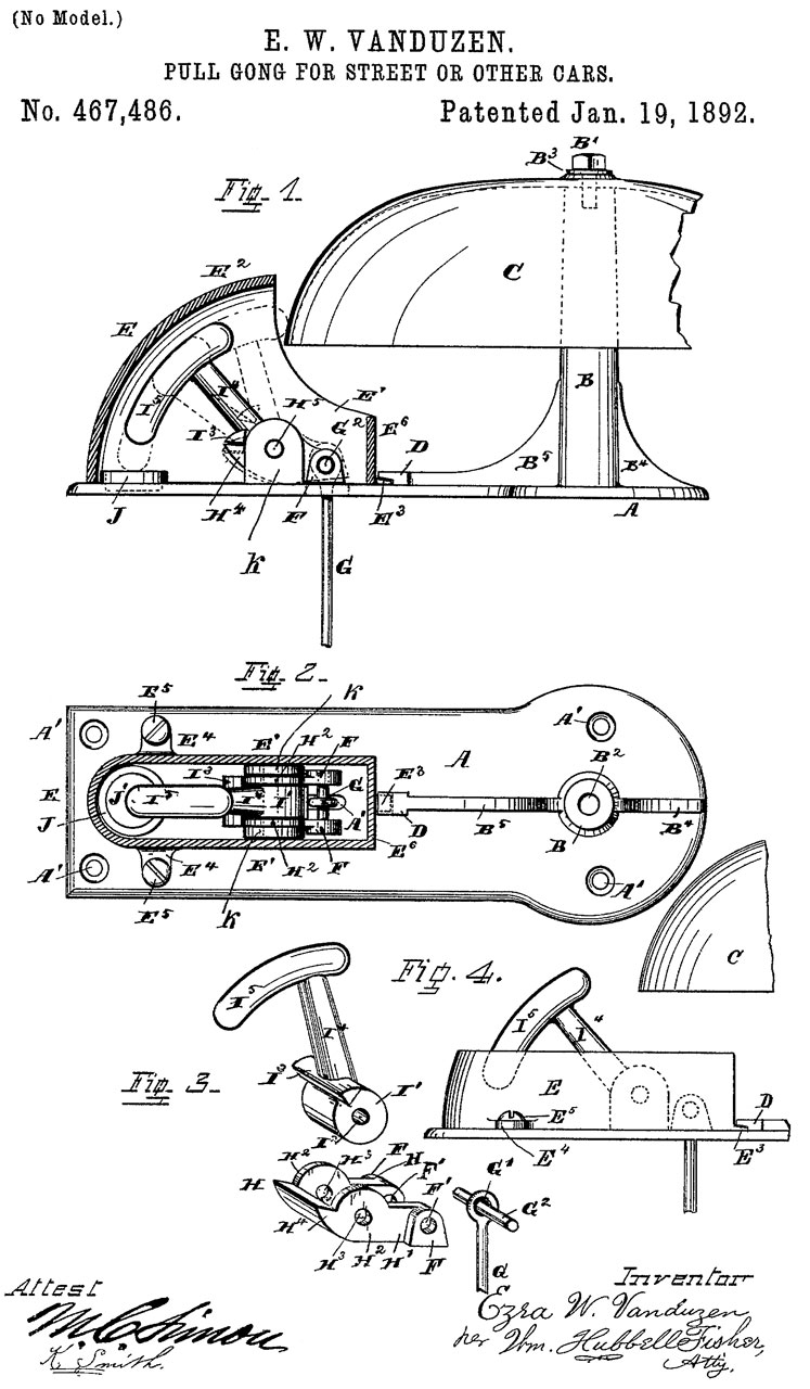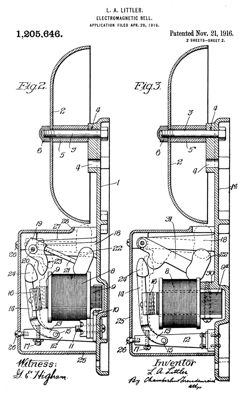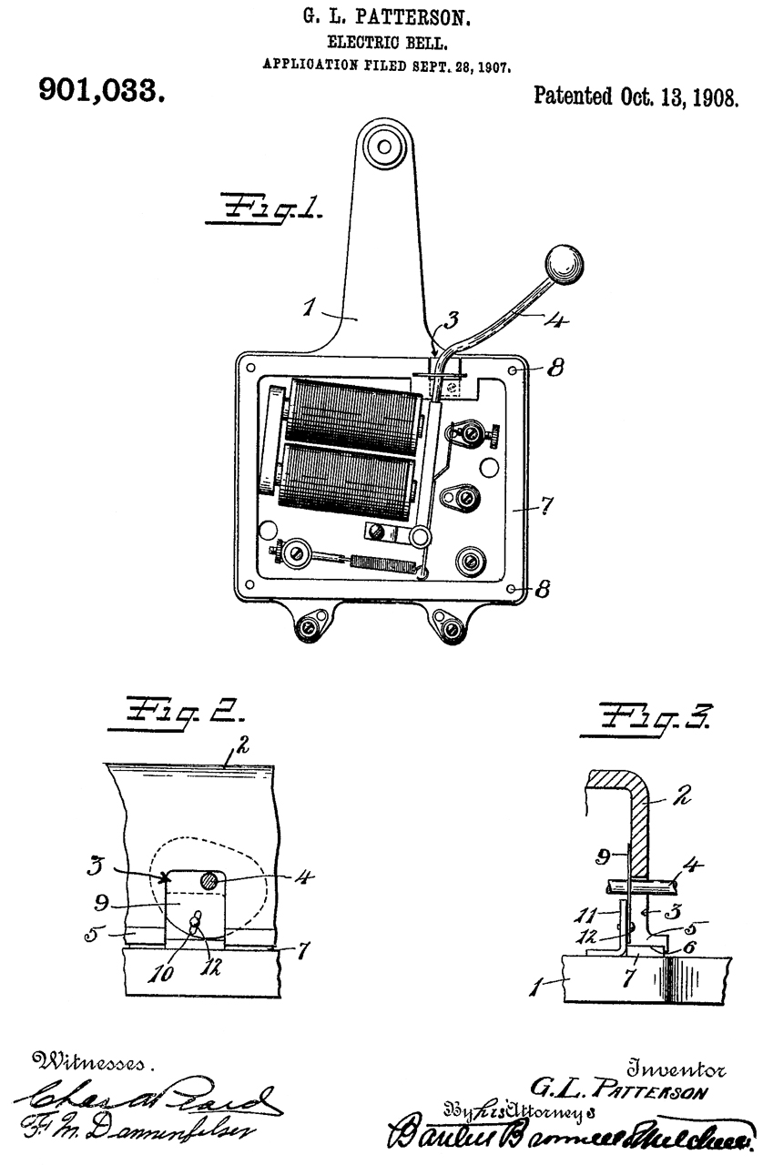 17355 electromagnetic fire-alarm telegraph for cities, W.F. Channing (Wiki) & M.G. Farmer (Wiki), May 19, 1857, 340/297; 340/298; 340/299 - Signal Station contains wheel (b) that can generate dots and dashes to signify the fire district and the box within that district. A pen register may be used to record the alarm. The Central Station repeats the alarm signal using a bell. The Alarm Station, located in a bell tower, broadcasts the alarm signal over a large area.