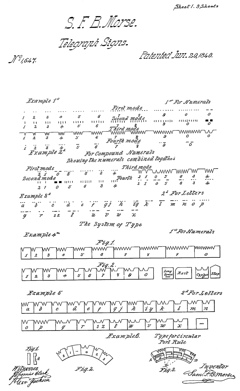 Samuel Morse invents the Telegraph symbols (see patent 1647 below) and uses a pen register to record them for later conversion to text. It turns out people working around the pen recorder quickly learn what character is being sent just by hearing it. The pen register is replaced with the telegraph sounder.