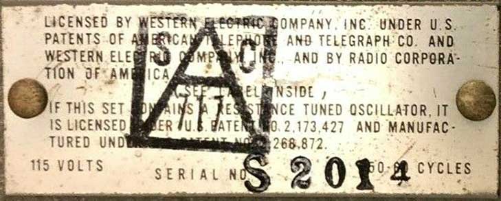 If this set contains a Resistance Tuned Oscillator, it is licensed under U. S. patent No. 2,173,427 and manufactured under U.S. patent No. 2,268,872."