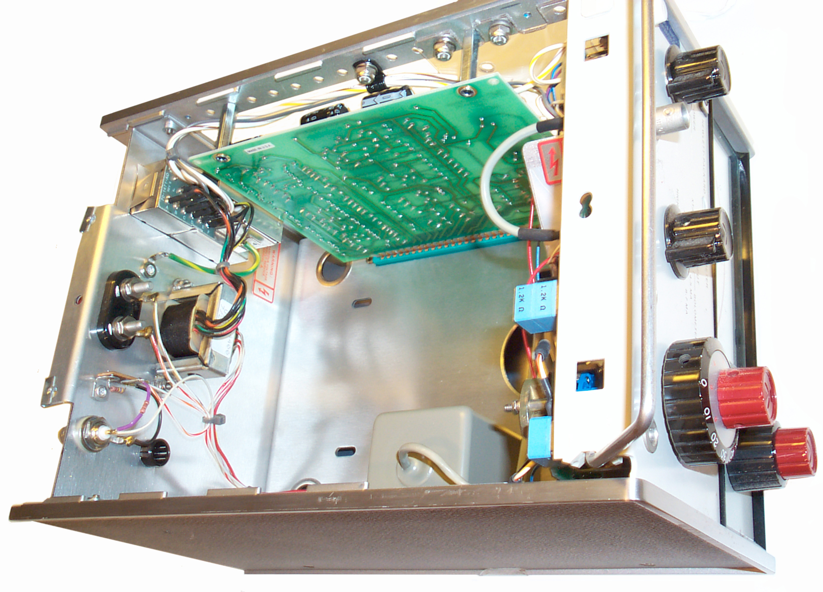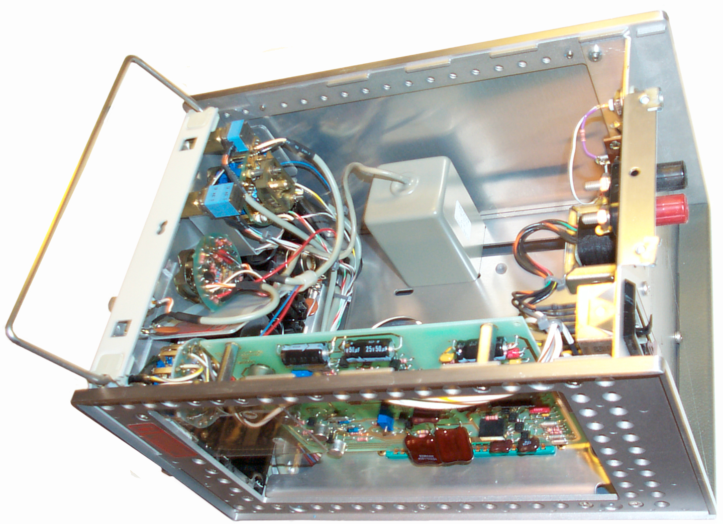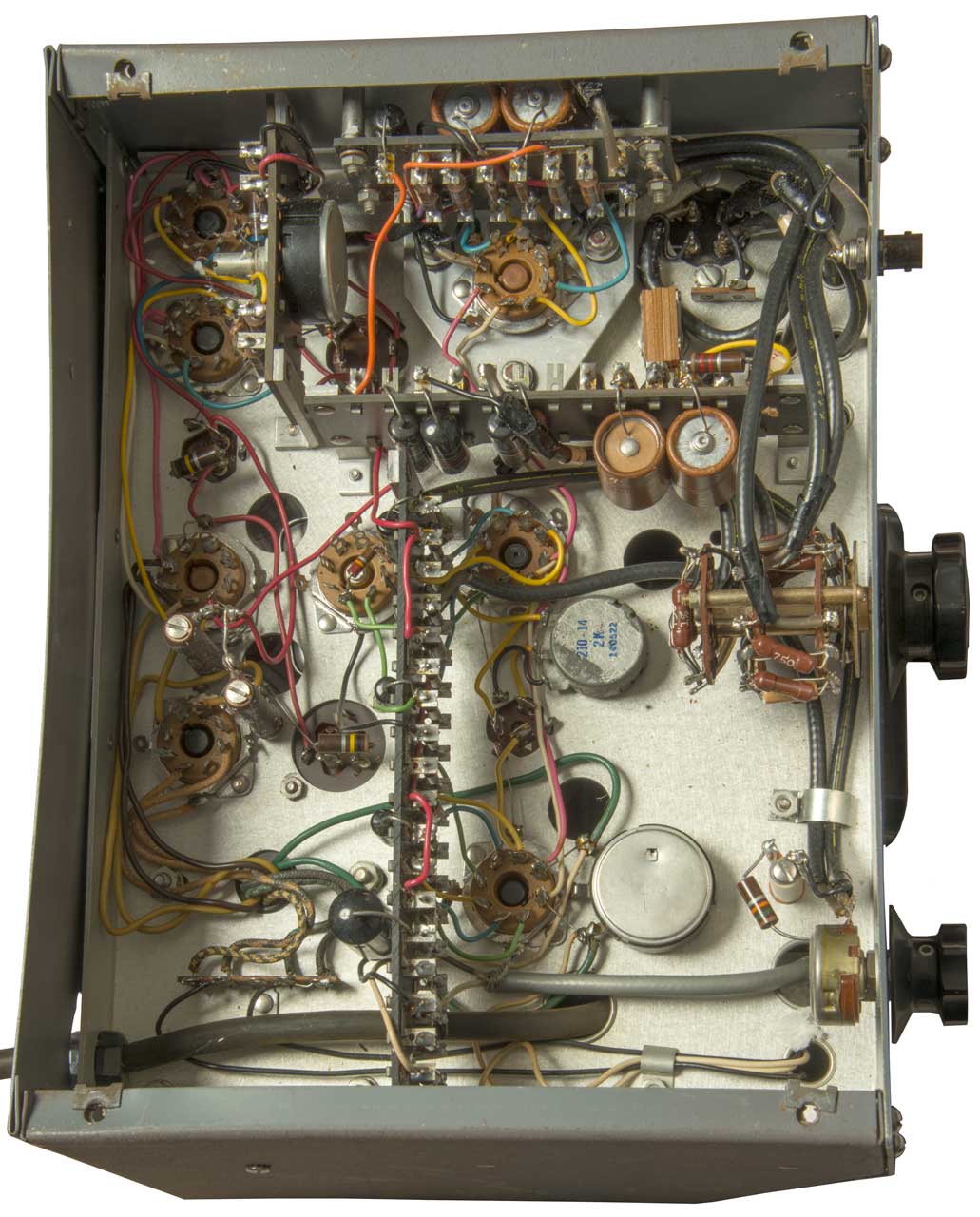 | Fig 4 Note aluminum can marked 1 kc. In theory it could be unplugged and replaced with a circuit for a different frequency. ![]() |