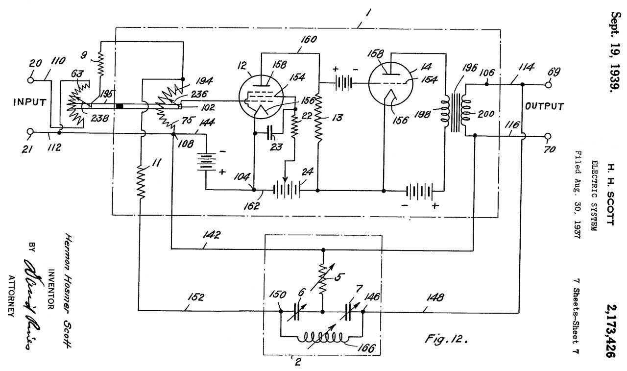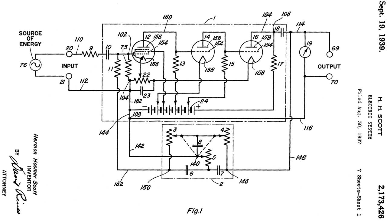 2173426 Electric system, Scott Hermon Hosmer, (Wiki HH Scott: Company, man), General Radio, 1939-09-19, 330/98; 330/85; 330/106; 330/109; 330/128; 333/171; 330/75; 330/96; 330/108; 330/127; 330/142; 333/172 -