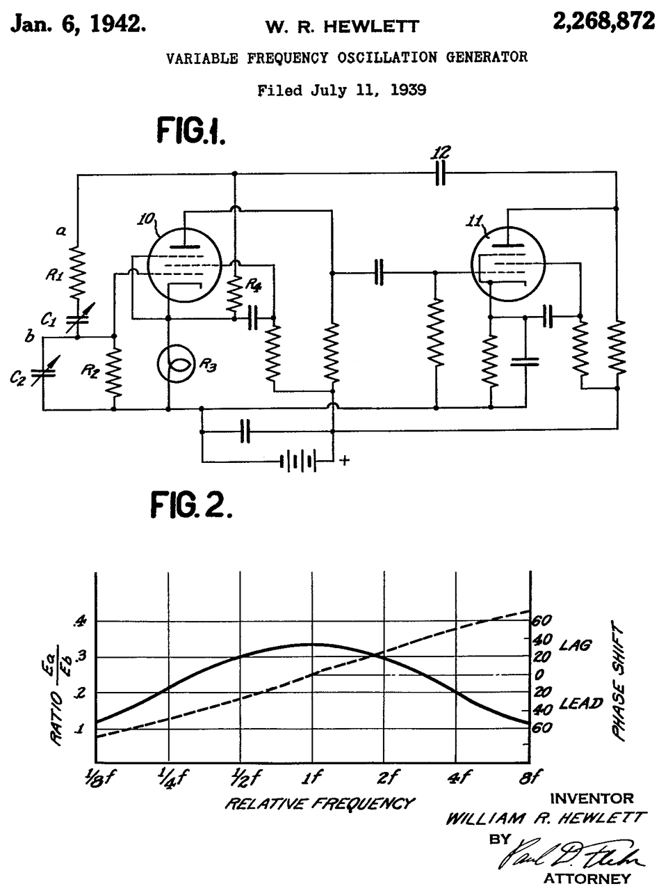2583943 Modified wien-bridge oscillator, William R Hewlett, HP, 1952-01-29, 331/141 - to extend upper and lower frequency limits.